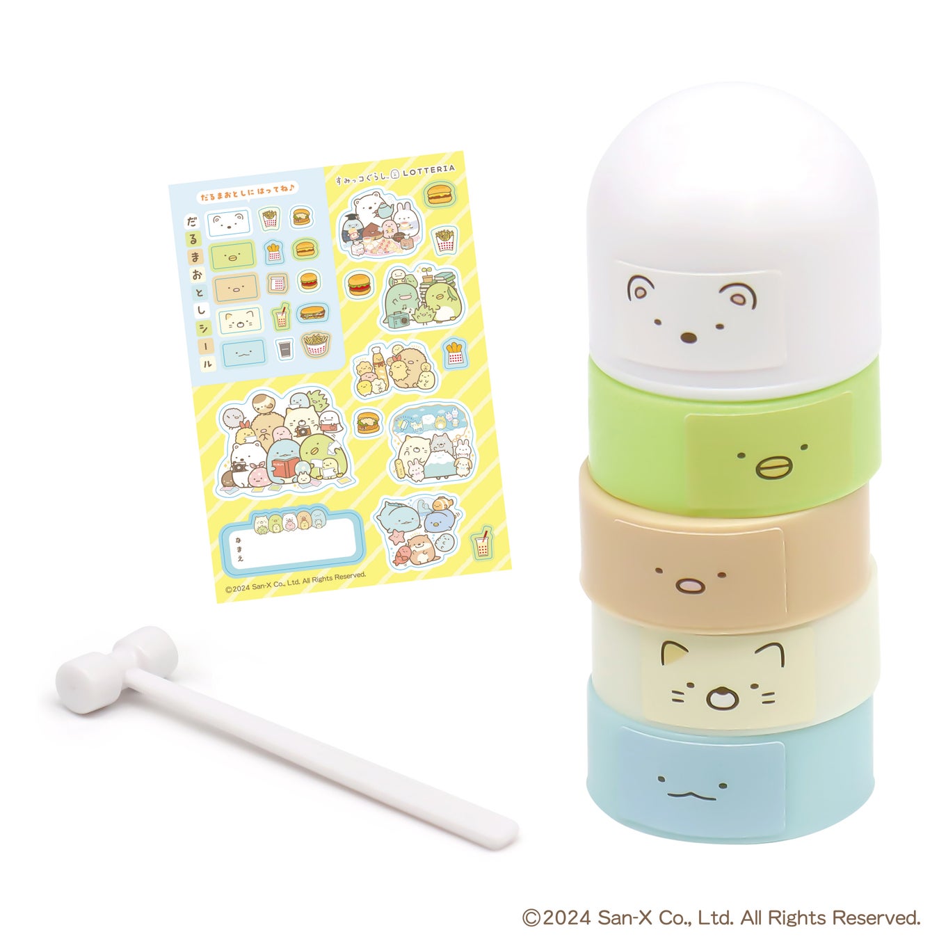 シールを貼ると、5体のすみっコが積み重ねられているようなかわいらしいだるまおとしになります。