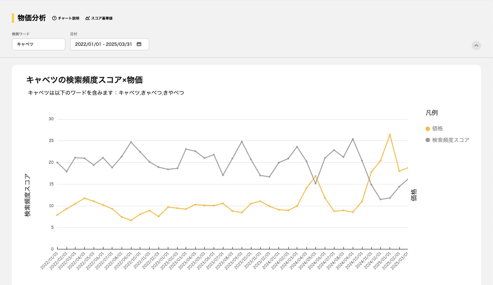 近年、異常気象や物価高の影響で、食に関する消費者の動向はめまぐるしく変化しています。2024年にキャベツの価格が高騰した際には、『デリッシュキッチン』アプリ内での「キャベツ」に関する検索数も大幅に減少しました。食品業界においては、今まで定番だった食材や料理に関する消費者のニーズをリアルタイムで把握し、戦略を見直していく必要があります。