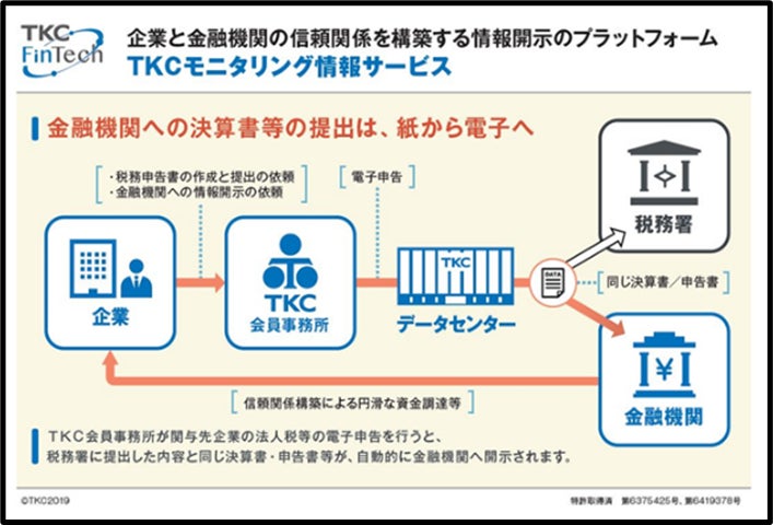 TKCモニタリング情報サービスは、TKC全国会会員(税理士・公認会計士)が毎月の巡回監査と月次決算を実施した上で作成した月次試算表、年度決算書などの財務情報を、関与先企業の経営者からの依頼に基づいて、インターネットを通じて無償で金融機関に開示するクラウドサービスです。