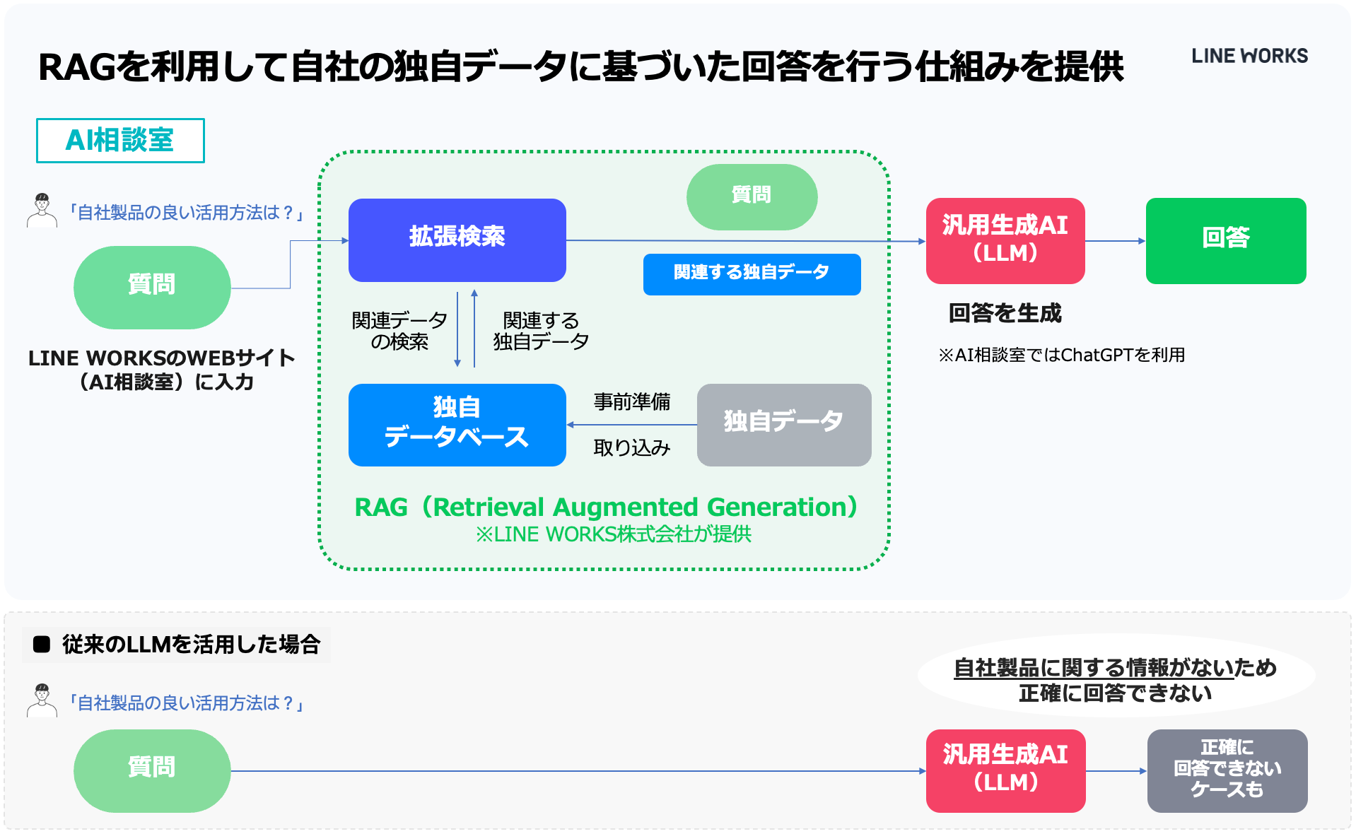 「AI相談室」は、「LINE WORKS」の公式WEBサイト上に実装された生成AIエージェントです。現在当社が取り組んでいるAI事業における新規プロジェクト「WORKS AI Project」の一環として、自社用AIエージェントを簡単に実装できる開発中の製品プロトタイプです。この製品は社内にあるさまざまな情報を活用し、ノーコード・ノープロンプトでRAG(Retrieval-Augmented Generation:検索拡張生成)を構築し、生成AIを通じて最適化された回答が得られます。なお、LLM(大規模言語モデル)には最新のChatGPTを採用しています。
