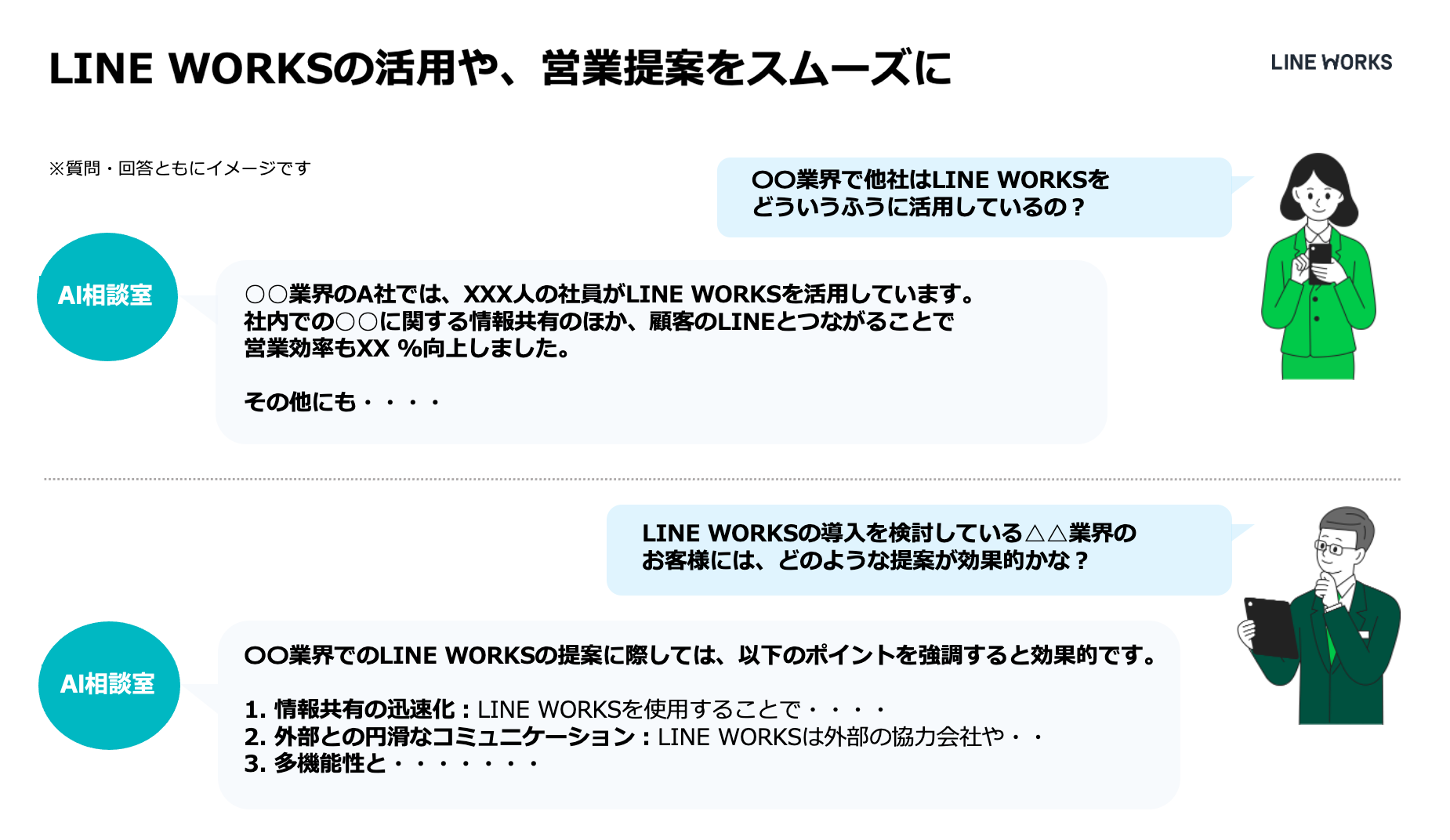 「AI相談室」では、「LINE WORKS」の300件を越える導入事例や活用ガイドなどの資料をRAGに登録しており、「LINE WORKS」に関するさまざまな疑問に対する回答を生成AIによって導きます。これから「LINE WORKS」の利用を検討されている方々の疑問に答えるほか、自社と同じ業界のユーザーによる「LINE WORKS」の活用方法はもちろん、「LINE WORKS」の営業提案に役立つ参考情報を生成AIが答えるなど、さまざまなシーンに活用できます。当社は「AI相談室」による質問への回答で解決までの時間を短縮し、ステークホルダーの皆様の満足度向上へつなげてまいります。