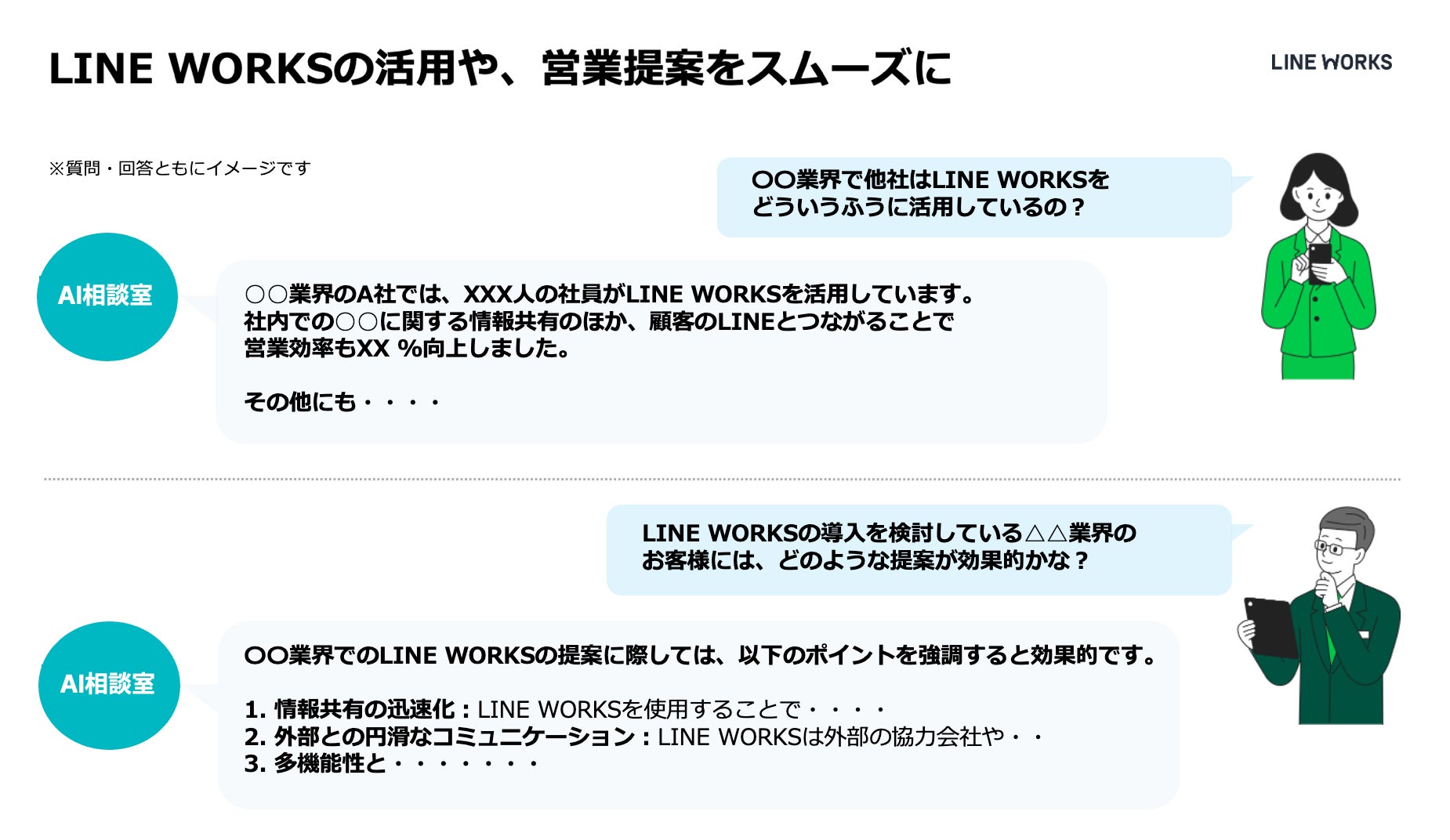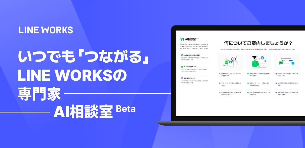 ビジネス現場のコミュニケーションツール「LINE WORKS」を提供するLINE WORKS株式会社(本社:東京都渋谷区、共同代表:島岡 岳史、増田 隆一、以下当社)は、「LINE WORKS」サービスに関するさまざまな相談や営業活動に役立つ情報を生成AIによって支援するAIエージェント「AI相談室」を、本日より「LINE WORKS」公式WEBサイトに開設したことをお知らせいたします。