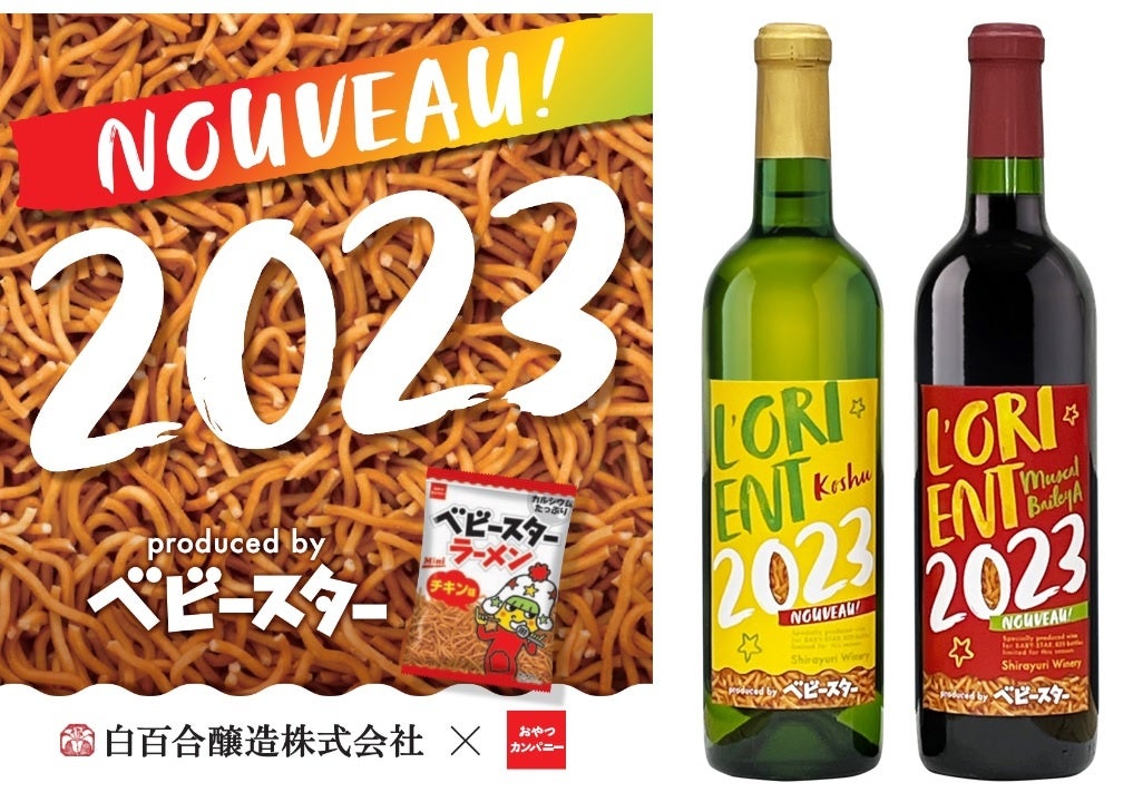 65年目を迎えたベビースターの記念すべきコラボ第18弾は、ワインにもベビースター⁉日本最大のワイン産地・山梨県のワイナリー・白百合醸造が今年収穫したブドウで作った新酒『ロリアン マスカット・ベーリーA 2023』『ロリアン 甲州 2023』を、ベビースターオリジナル限定ラベルとして、2023年11月3日(金)より販売開始します。