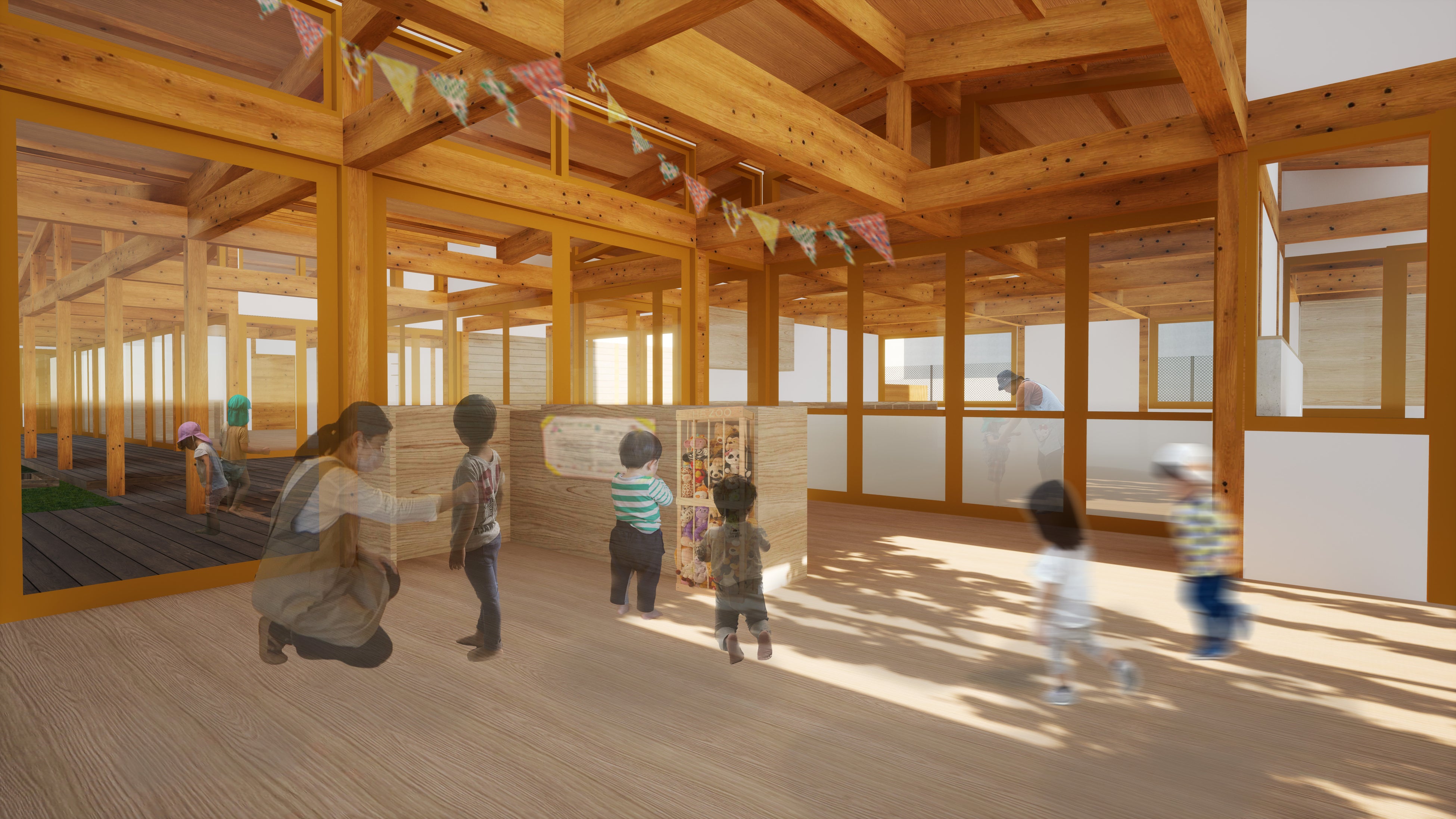 保育室は開放的で可変性が高く、木の温もりを感じられる空間になります。