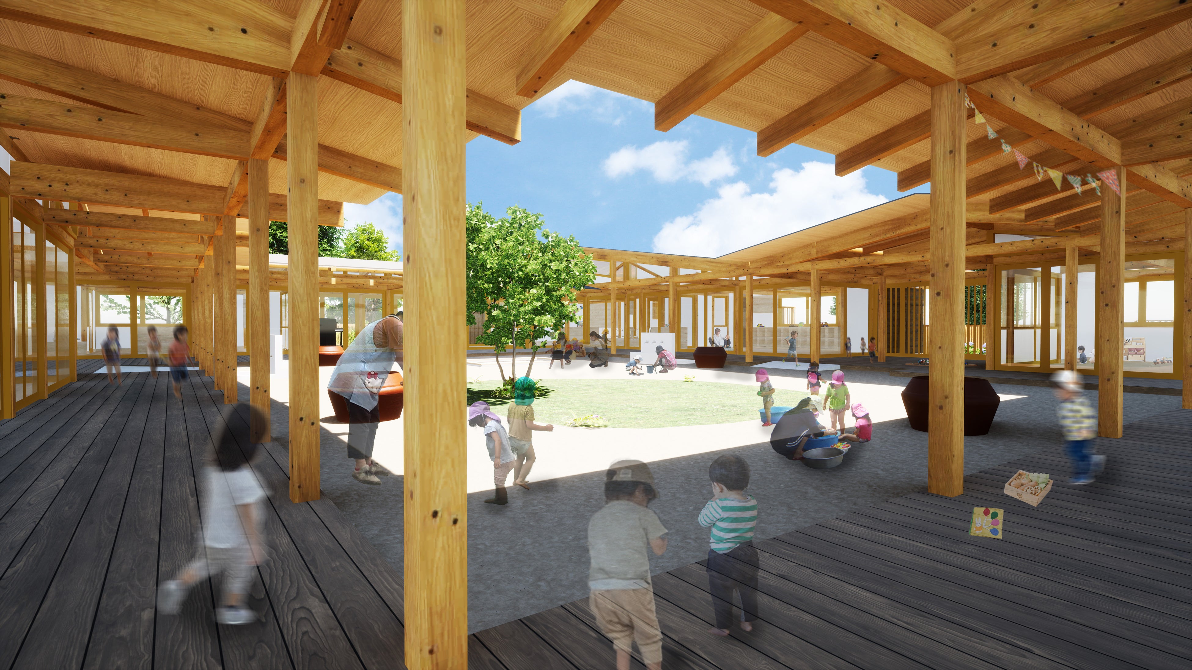 新しい保育園は114組の提案から選ばれた、名古屋工業大学大学院の中山朋紀さん(2年)と原希望さん(同)、永井里奈さん(1年)のアイデア「風土の中のさんぽミチ」をコンセプトに設計されました。木の温もりにあふれ、四季の変化を感じられるとともに、子どもたちの主体性を育む保育環境を具現化します。