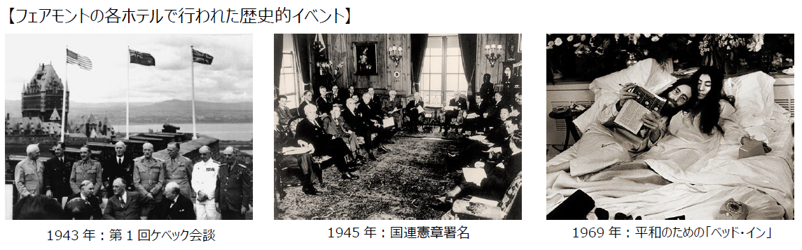 「フェアモント」の各ホテルは歴史的なイベントでも大きな役割を果たしてきました。1943年には、「フェアモント ル シャトー モンテベロ」にて、ウィリアム・ライアン・マッケンジー・キング加首相と、ノルマンディ上陸作戦の計画を策定していたウィンストン・チャーチル英首相およびフランクリン・ルーズベルト米大統領による第1回ケベック会談が行われました。1945年には、「フェアモント サンフランシスコ」のガーデン ルームで国連憲章がまとめられ、50ヶ国が署名しました。モントリオールの「フェアモント ザ クイーン エリザベス」にて、ビートルズの元メンバー、ジョン・レノンとオノ・ヨーコが歴史的な平和のための「ベッド・イン」のパフォーマンスを行ったのは1969年。反戦運動のテーマ曲となった「Give Peace A Chance(平和を我等に)」を作曲し、レコーディングを行いました。