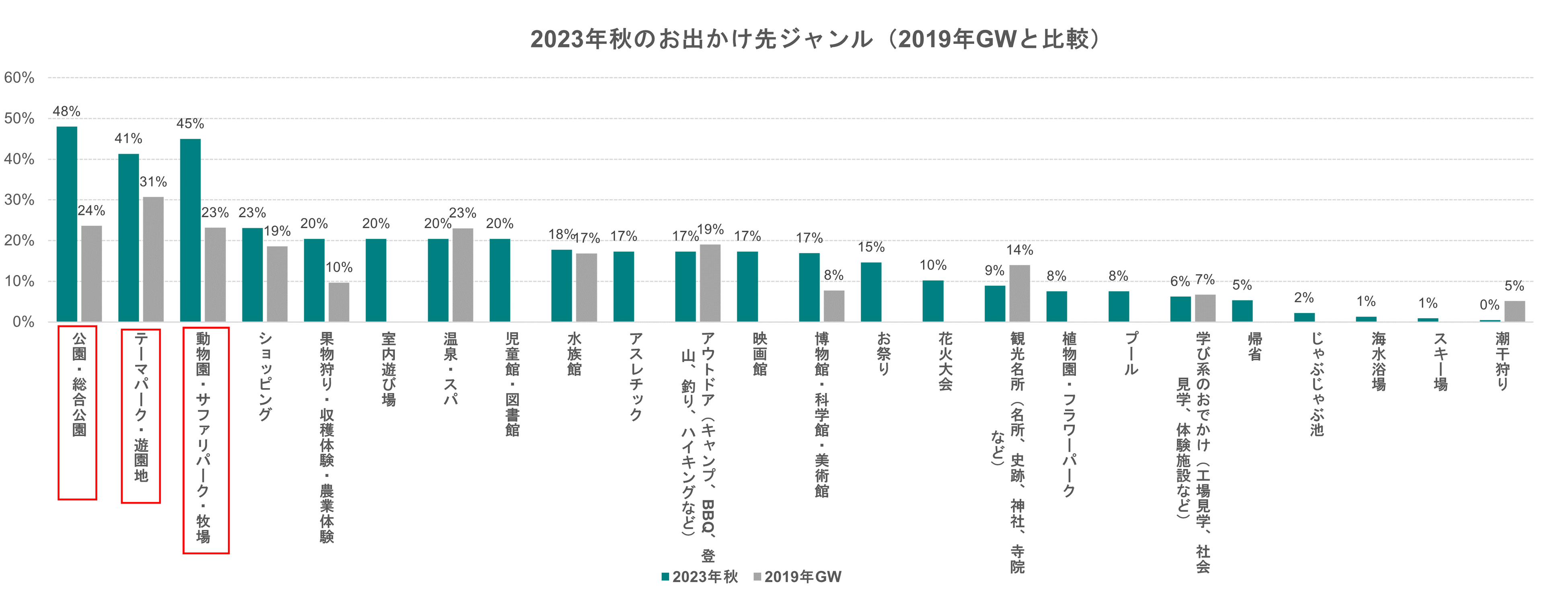 やはり今年の秋は、「公園・総合公園」「テーマパーク・遊園地」「動物園・サファリパーク・牧場」「果物狩り・収穫体験・農業体験」などが、同じく季節のいいGWと比べてみても、差をつけて人気であることがわかります。