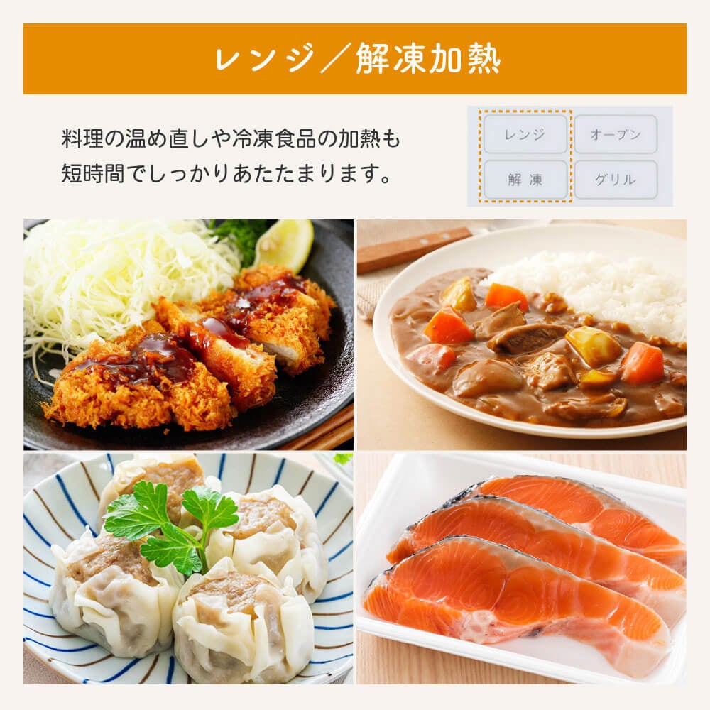 本製品は、温度センサー搭載のヒーターによる適切な加熱で食品を均一に焼き上げるオーブン、肉や魚を一気に焼き上げるグリル、料理の温め直しや冷凍食品の加熱に便利なレンジという3つの機能を1台で手軽にご利用いただけます。