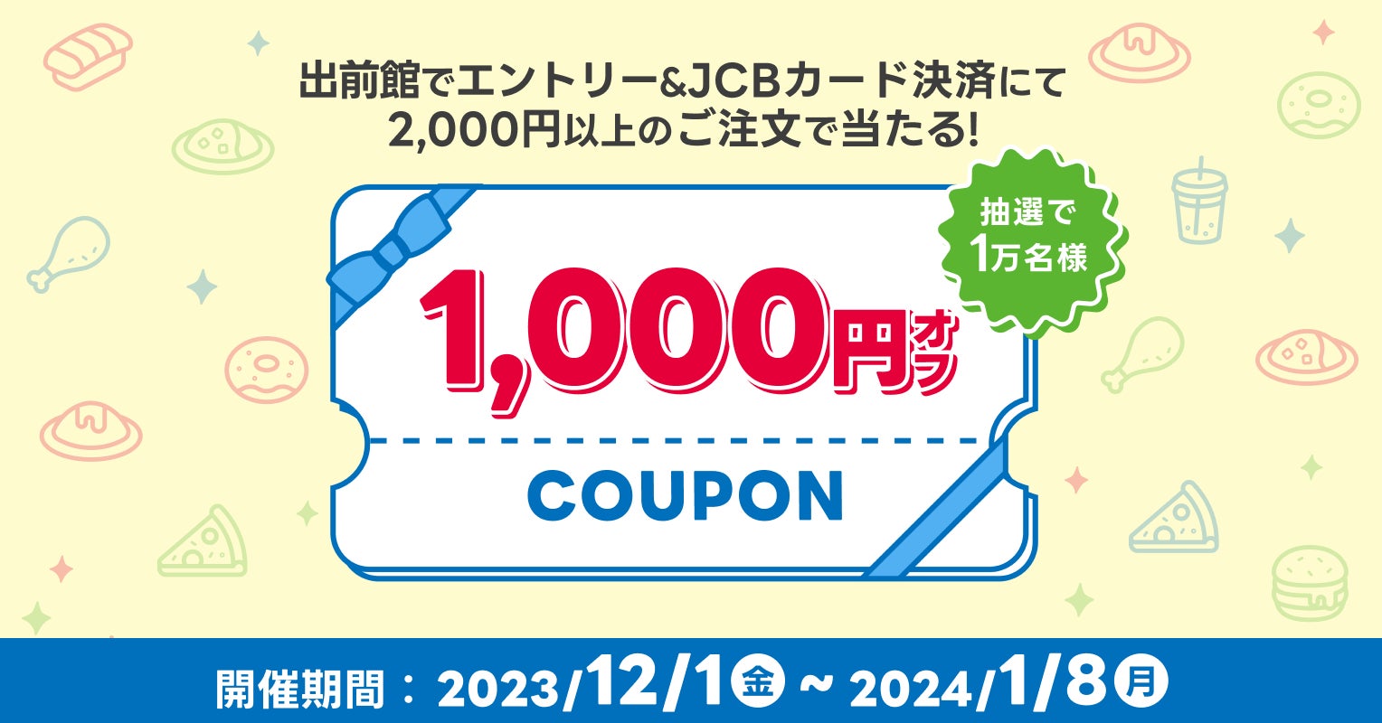 期間中にキャンペーンページからエントリー&対象のJCBカードを利用して『出前館』で2,000円以上の決済をされた方の中から抽選で1万名さまに、次回以降のご注文時にご利用いただける1,000円オフクーポンを後日『出前館』より進呈いたします。