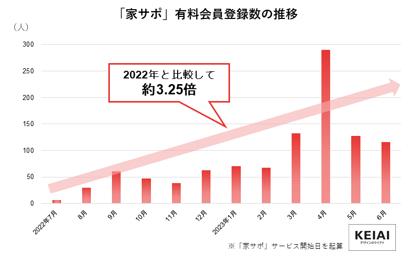 このように物価高騰が継続している状況の中、持ち家の定期点検、長期保証サービスの他に日々のメンテナンスや修繕コストにおいて、より安心して過ごしていただける「KEIAI家サポ」へのニーズが高まっています。会員登録の推移をみてもサービス開始の2022年7月から同年12月までと2023年1月から同年6月を比較すると約3.25倍という結果になり、有料会員登録者数が1,000名を突破しました。