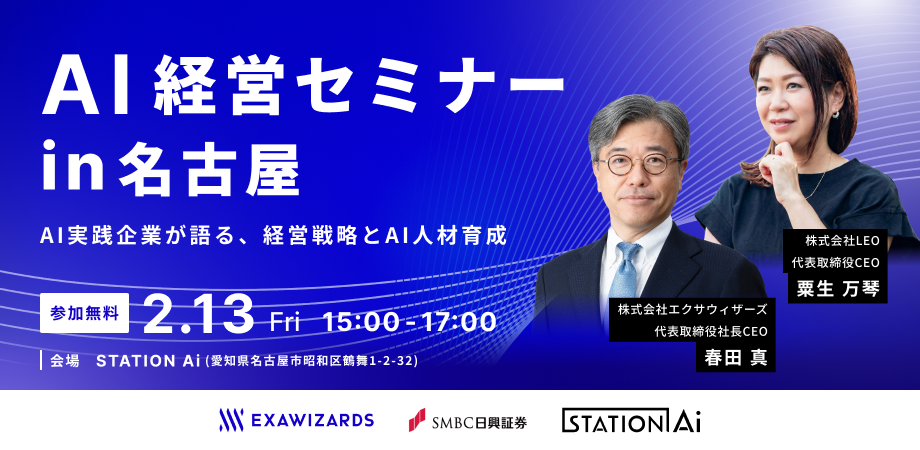 株式会社エクサウィザーズ(東京都港区、代表取締役社長CEO:春田 真、以下エクサウィザーズ)は、2026年2月13日(金)、名古屋最大のスタートアップ支援拠点「STATION Ai」にて、東海エリアの経営層・マネジメント層を対象とした「AI経営セミナー in 名古屋 ー AI実践企業が語る、経営戦略とAI人材育成 ー」を開催します。本セミナーは、SMBC日興証券株式会社と共催、STATION Ai株式会社の協力により、東海エリアにおける企業の競争力強化とAI実装の加速を目的としています。
