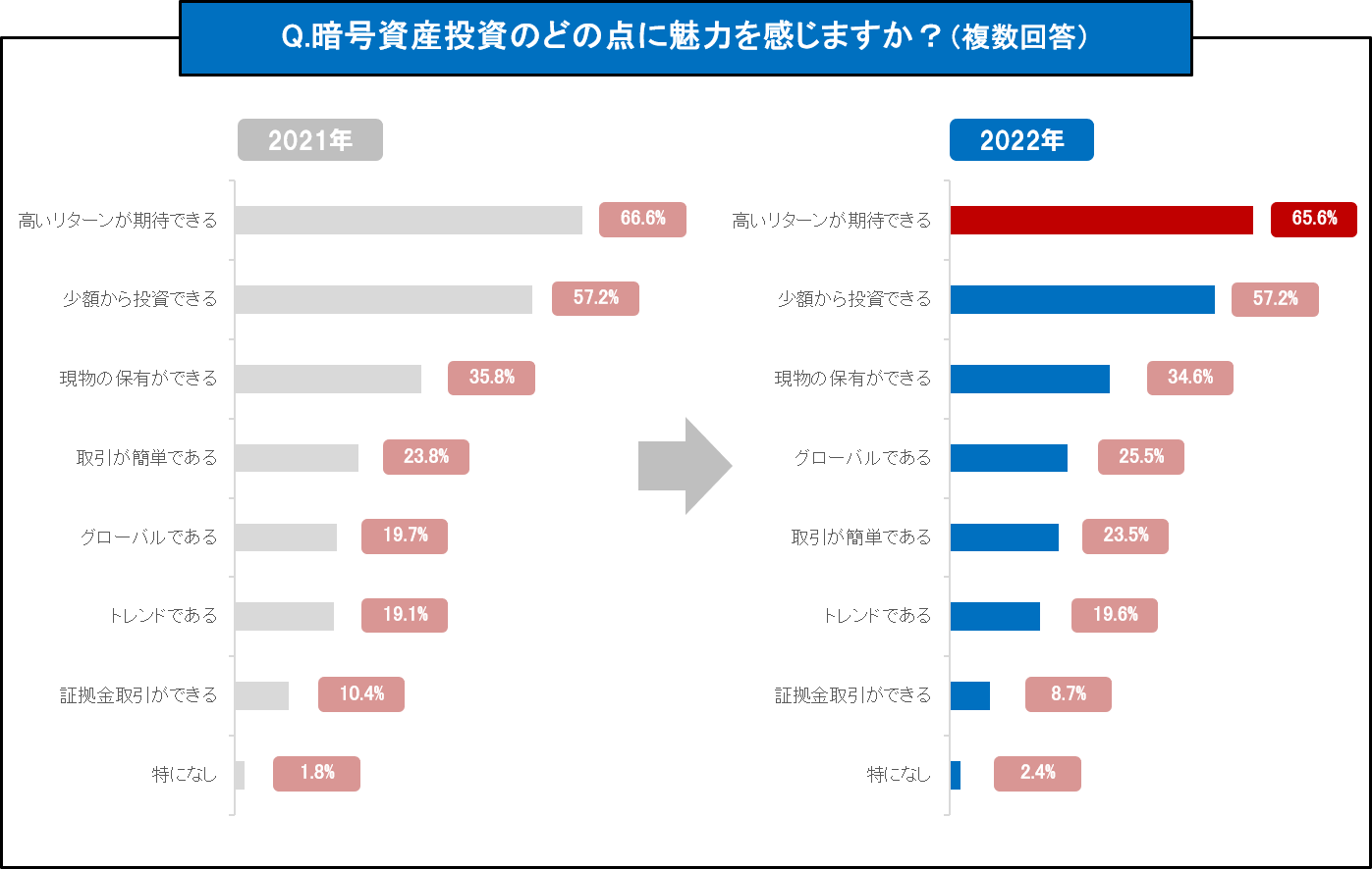 - 暗号資産の魅力は「高いリターン」が2年連続で第1位!