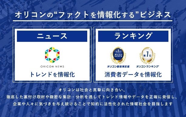 オリコンは「事実を情報化する」を経営理念に掲げ、「ORICON NEWS」をはじめとする“ニュース”、「オリコン顧客満足度」「オリコンランキング」などの“ランキング”を提供する調査会社です。社会と真摯に向き合い、徹底した裏付け取材や緻密な集計・分析を通してトレンド情報やデータを正確に発信し、企業や人々に気づきを与え続けることで知的に活性化された情報社会の実現を目指します。