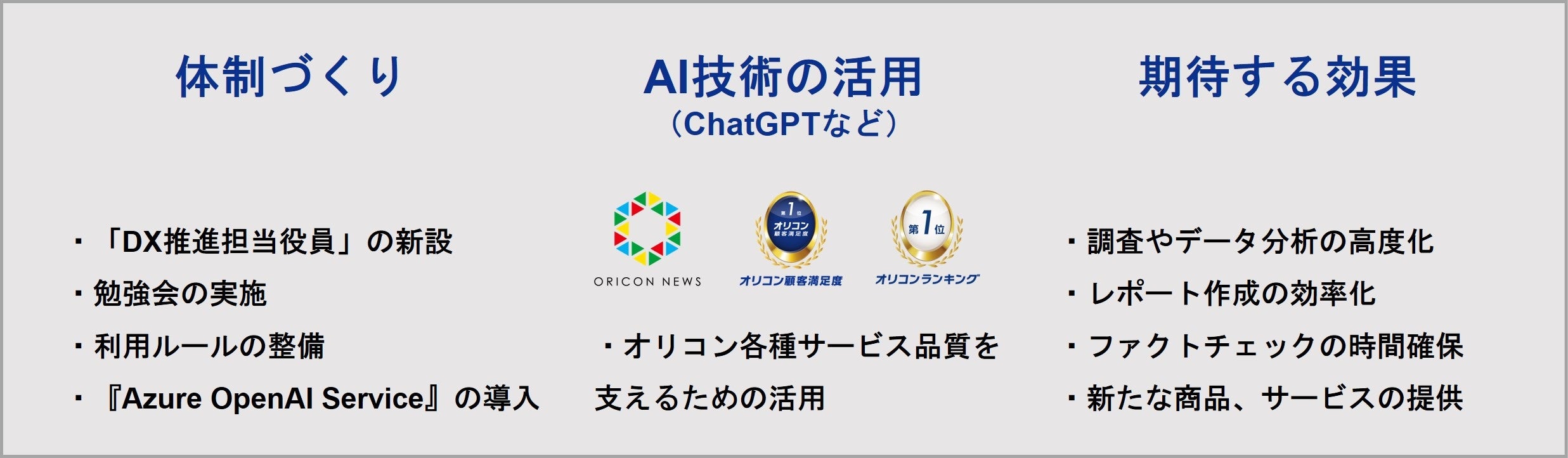 オリコンは、社訓にAI活用に関する項目[1]を設けており、これまでもシステムの自社開発や、AI技術を積極的に活用するなど、オリコン・グループ全体で業務のDX化に取り組んできました。