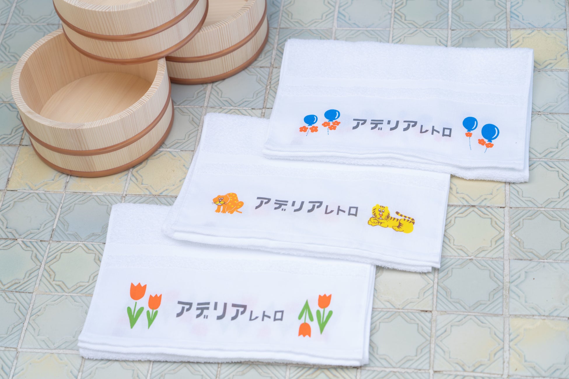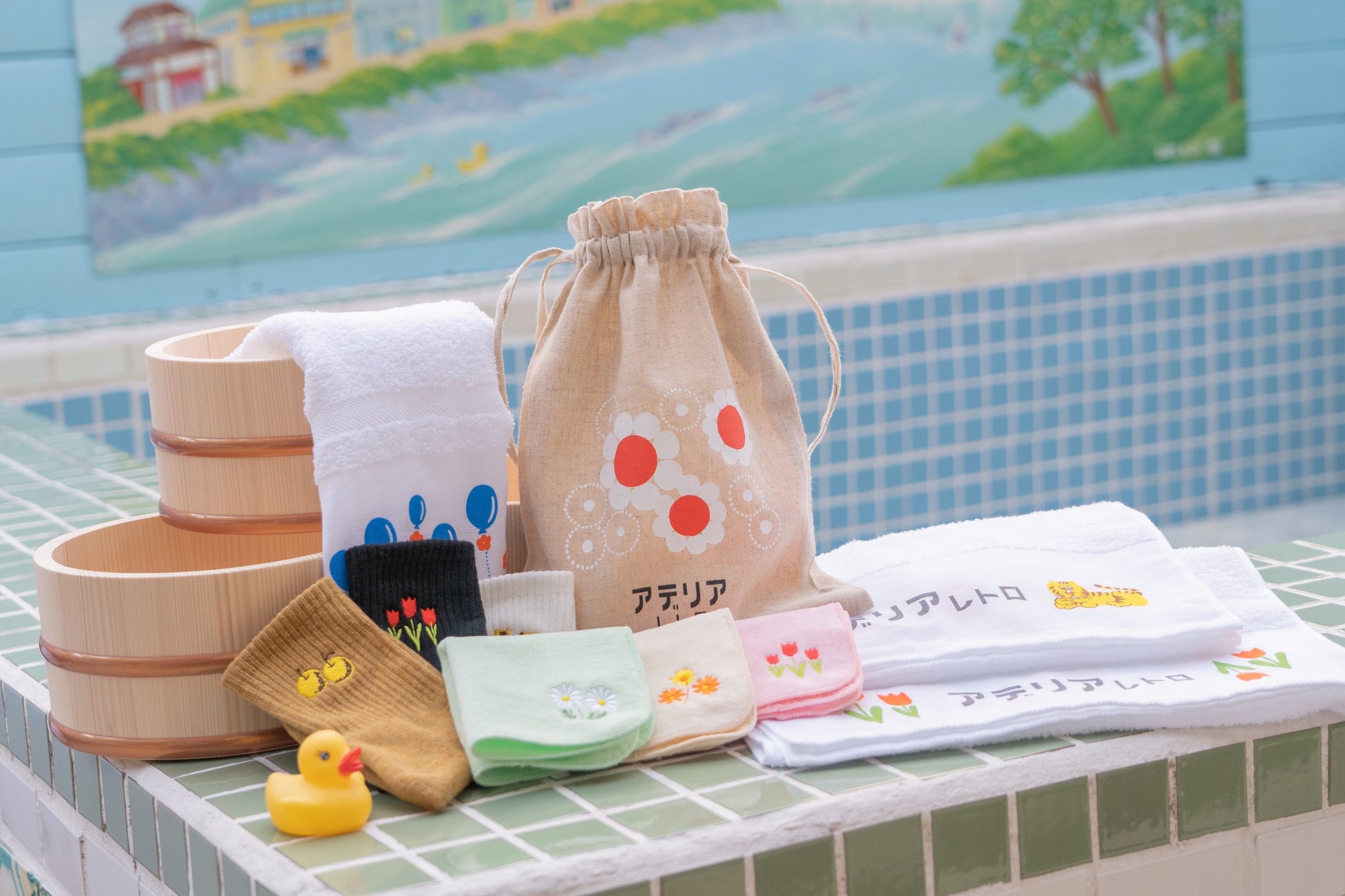 アデリアレトロの絵柄の温泉タオルや、着替えを入れる巾着などおふろ屋さんで役立つコラボグッズも販売中!