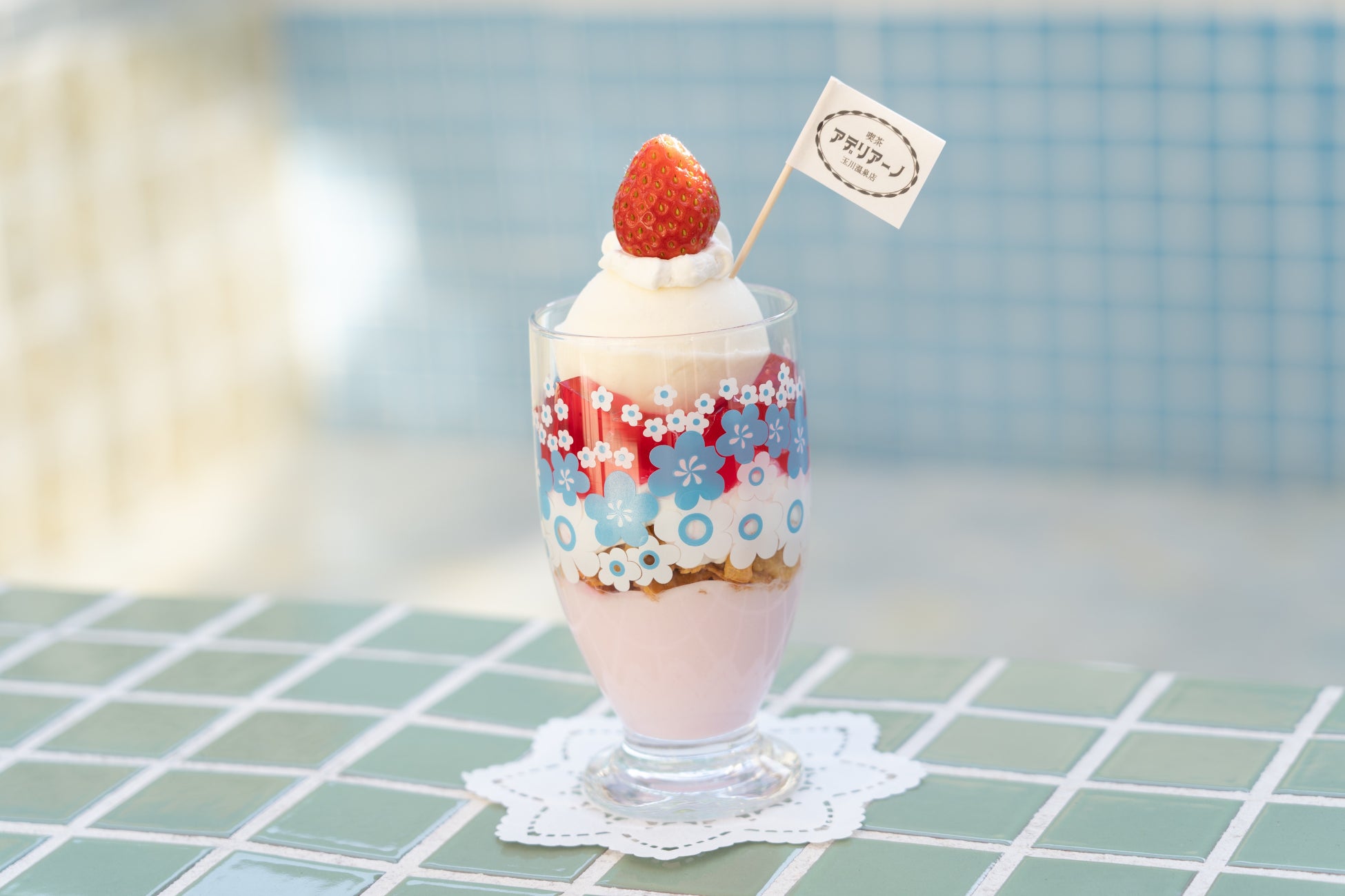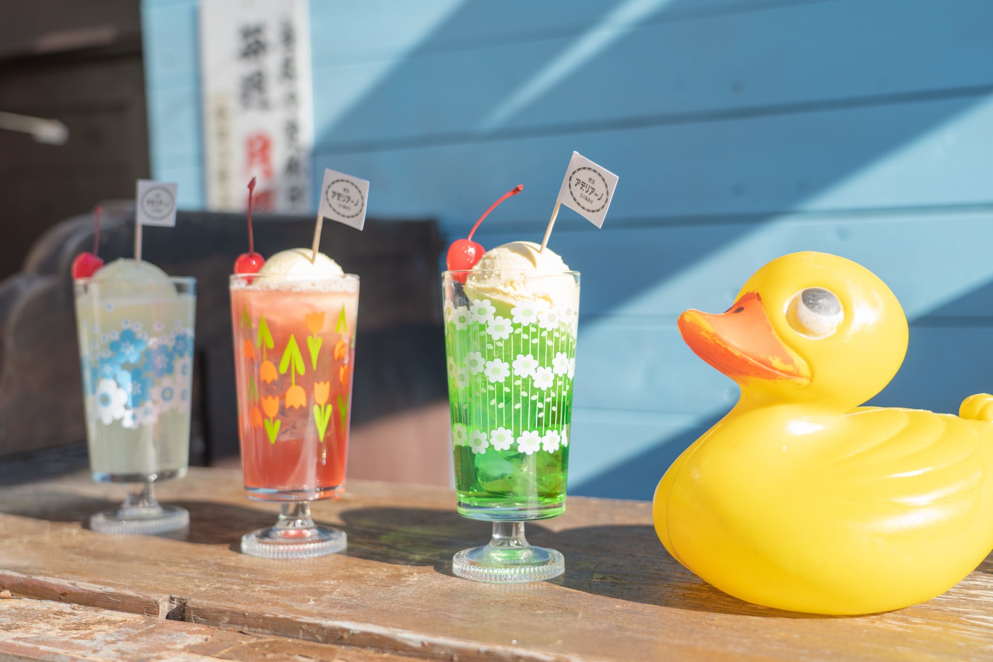 昭和にタイムスリップしたような玉川温泉のあたたかな雰囲気の中で、アデリアレトロのグラスを使用した限定コラボメニューをお楽しみいただけます。埼玉の地サイダーを使ったクリームソーダの他、いちごパフェ、大人のお子様ランチなどもご用意しております。