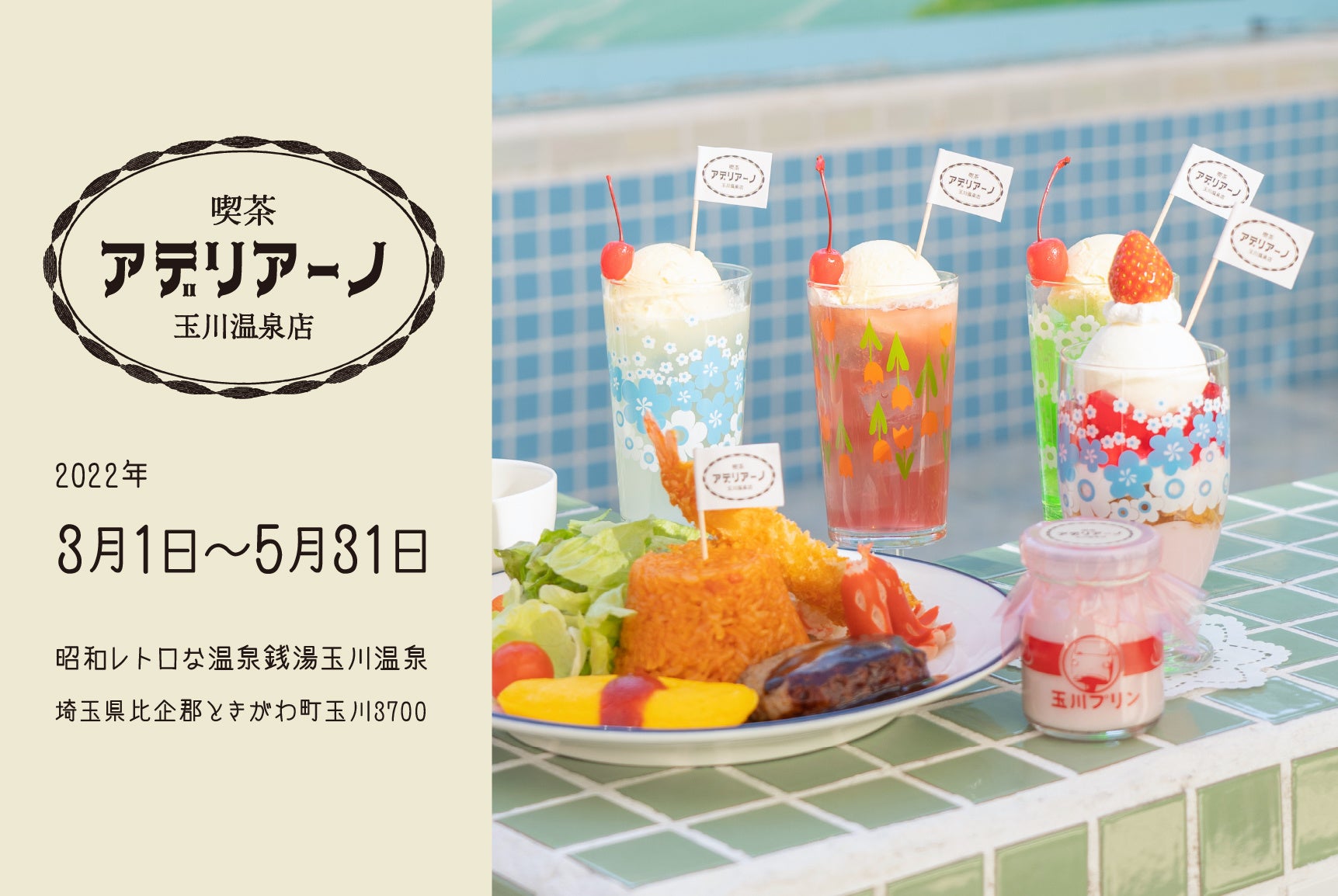 株式会社温泉道場(埼玉県比企郡ときがわ町、代表取締役 山崎寿樹)が運営する温浴施設、昭和レトロな温泉銭湯 ⽟川温泉(埼玉県比企郡ときがわ町)は、石塚硝子株式会社(愛知県岩倉市)の人気グラスウェアブランド「アデリアレトロ」とのコラボグッズ販売を記念し「喫茶アデリアーノ 玉川温泉店」を2022年3月1日(火)〜5月31日(火)の期間限定で開催いたします。