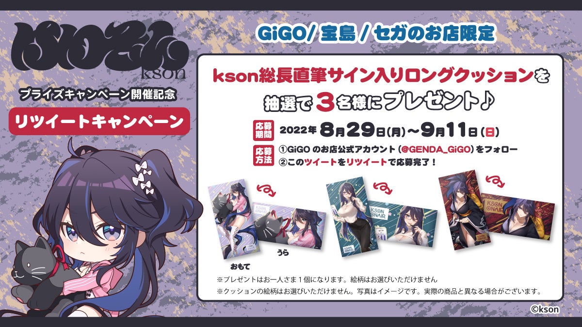 Twitterアカウント(https://twitter.com/GENDA_GiGO)をフォローの上で、該当のツイートをリツイートされたお客さまの中から抽選で3名様に「kson総長直筆サイン入りロングクッション」をプレゼントいたします。