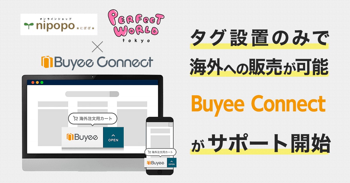海外のお客様の購入利便性を向上させるため、「perfect world tokyo」「nipopoオンラインショップ」は「Buyee Connect」を導入し、サイト上に新たに海外からのアクセス者に向けた専用カートを開設いたします。「Buyee Connect(https://beecruise.co.jp/infra/buyeeconnect/)」は、タグ設置のみで自社ECサイト上に海外専用カートを簡易に開設することができ、世界118ヵ国/エリアのお客様がシームレスに購入できるサービスです。「Buyee Connect」の導入により、ECサイト事業者様は国内ECのオペレーションを変更せずに越境EC対応が可能で、多言語CS対応、海外配送、決済などの必要な機能は全て「Buyee」が対応します。