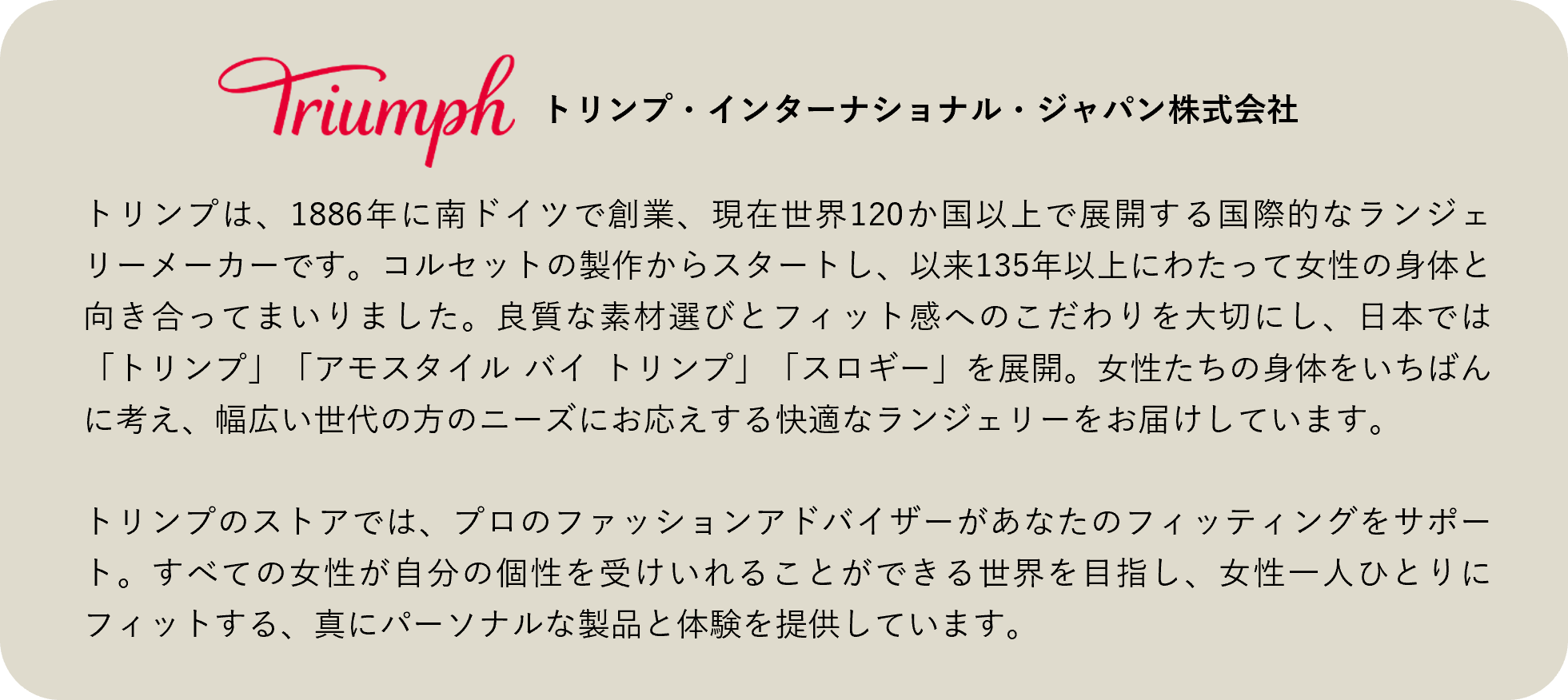 トリンプのストアでは、プロのファッションアドバイザーがあなたのフィッティングをサポート。すべての女性が自分の個性を受けいれることができる世界を目指し、女性一人ひとりにフィットする、真にパーソナルな製品と体験を提供しています。