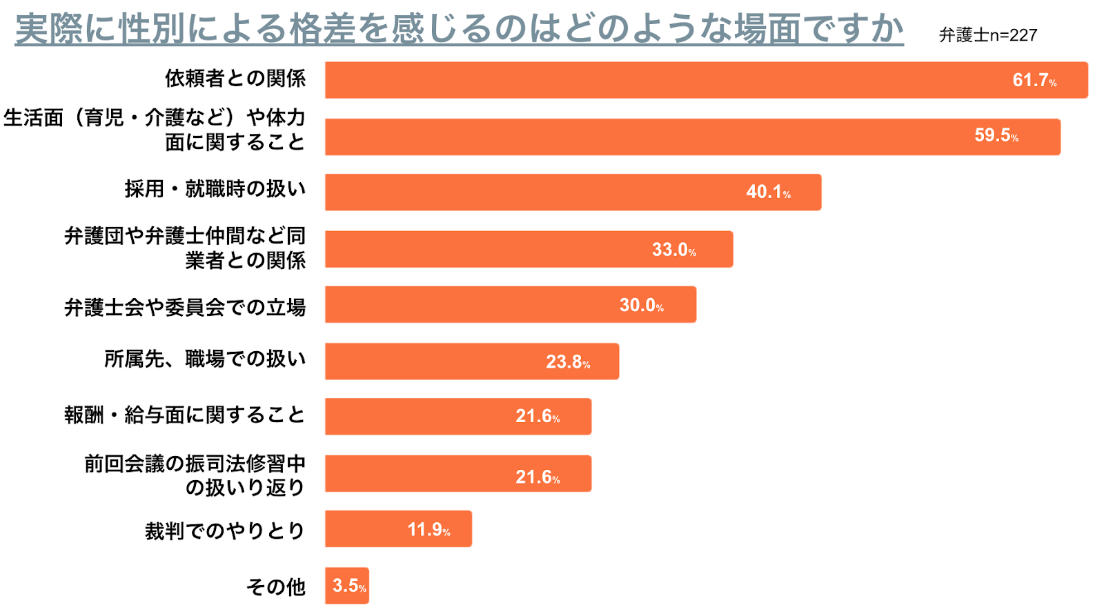 法曹界でジェンダーギャップを感じる人に、実際に格差を感じる場面を尋ねたところ、「依頼者との関係」が61.7%と最も多く、女性弁護士と男性弁護士で依頼者の態度が違うなど、一般の人からはいまだ弁護士=男性と捉えられている実態が見えてきます。