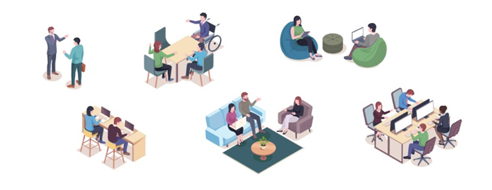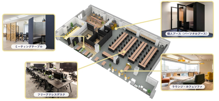 オフィスにABWを導入する際、まずは全体のコンセプトを考えます。次に、エリアごとの用途にあわせたコンセプトを検討します。ABWはエリアごとに雰囲気を変え、気分転換できるようにするのも目的の1つなので、エリアごとに段階的に導入することが可能です。