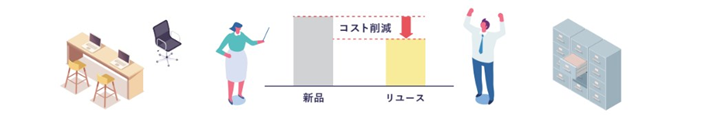 オフィス内ABWを実現するためには、さまざまなオフィス家具が必要です。しかし、その中には値が張るものもあり、全てを希望通りに新品で揃えると予算をオーバーしてしまうことも。そのようなケースでは、こだわりの少ない部分にリユース什器を活用すると、コストを抑えることができます。