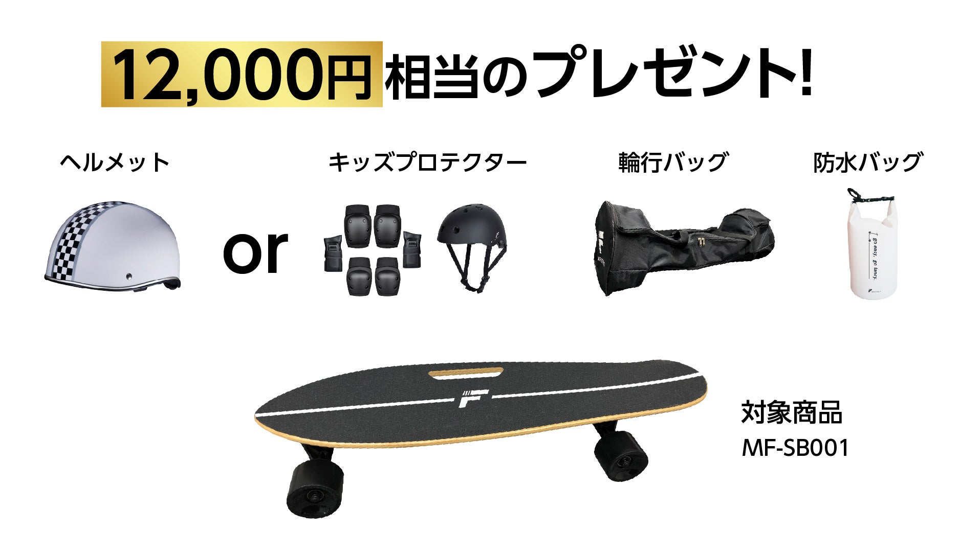 また、電動スケートボードをご購入で7,000円相当のヘルメットもしくはキッズプロテクターとMEISTER.Fオリジナル防水バッグをプレゼントします。