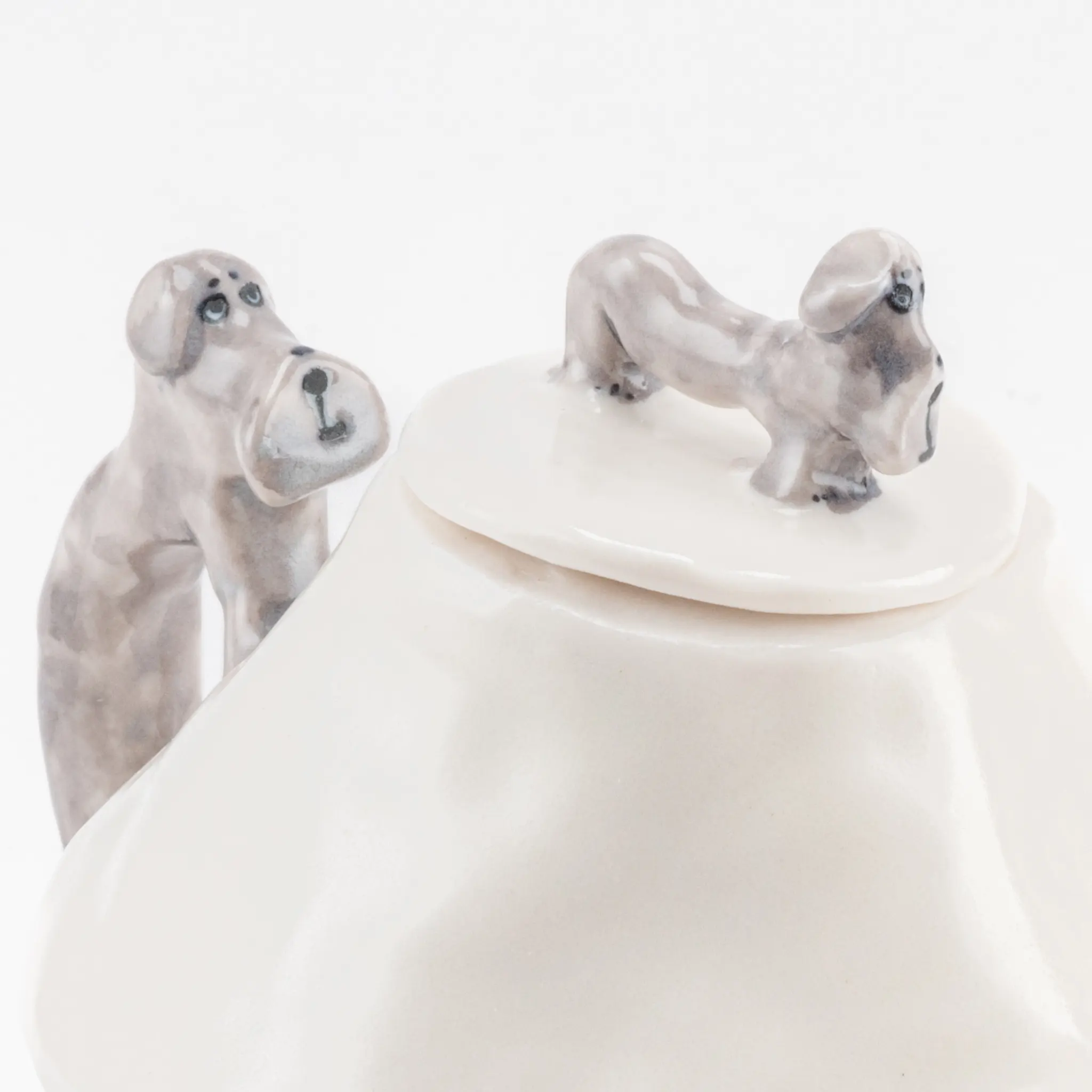 ポットのフタは子テリア、取っ手は親テリア。なんだか心配そうに子テリアを見つめる親テリア。子テリアは高いところに登ってちょっと誇らしげに見えます。