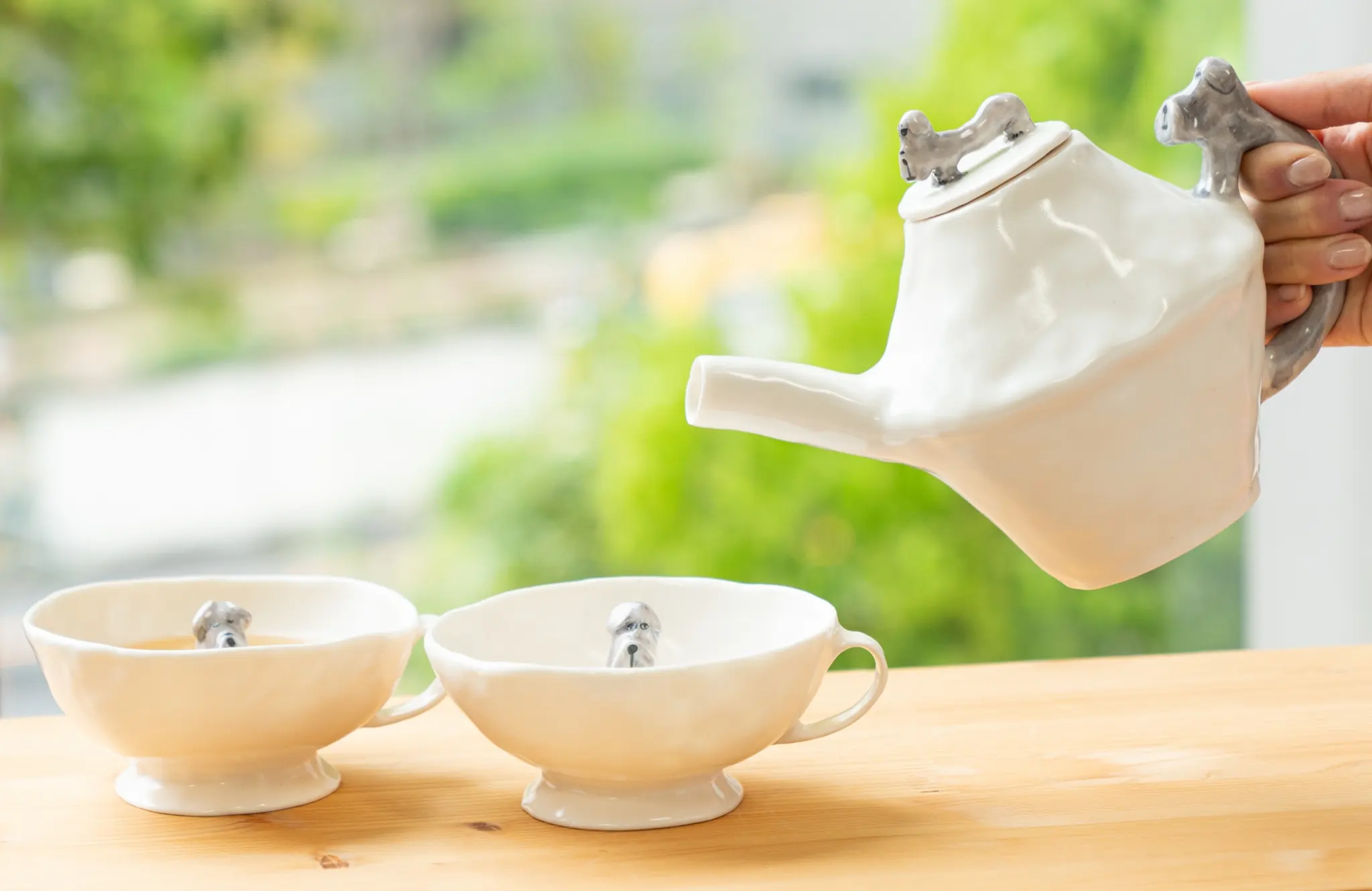 今なら親子のポットとおじいテリアのティーカップセットもあります。犬だらけティータイムだなんて、まあ楽しい!!ワン!