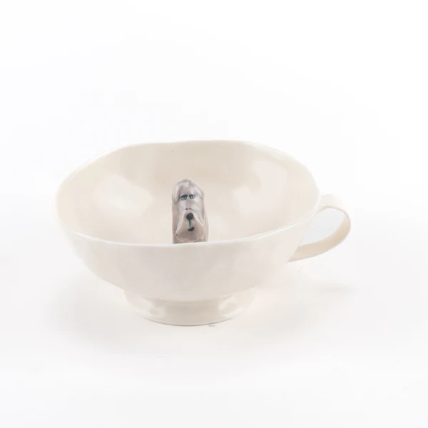 コーヒーカップよりも一回り大きく、エレガントな高台がついているティーカップ。ゴツゴツした手作りの質感を強調することで、犬の体温まで感じられるような温かみのある雰囲気が大人気。犬のパーツはもちろん、カップも、全てひとつひとつエレオノール自身の手作りです。
