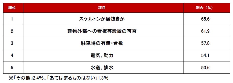 また仕様・設備を聞いたところ、1位が「スケルトンか居抜きか」で65.6%でした。2位は「建物外部への看板等設置の可否」61.9%、3位は「駐車場の有無・台数」57.8%と続きました。