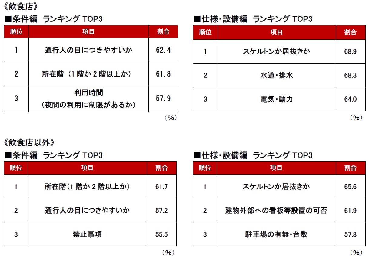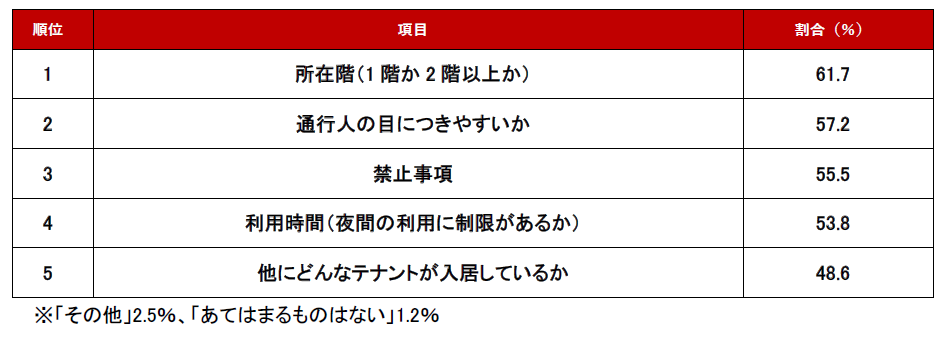 続いて、飲食店以外の貸店舗を選ぶ際にチェックしておくべき条件を聞いたところ、1位が「所在階(1階か2階以上か)」で61.7%と6割を超えました。2位は「通行人の目につきやすいか」で57.2%、3位は「禁止事項」で55.5%でした。飲食店と同様に、人通りの多さや人が入りやすい位置であるかは重要なポイントと言えそうです。