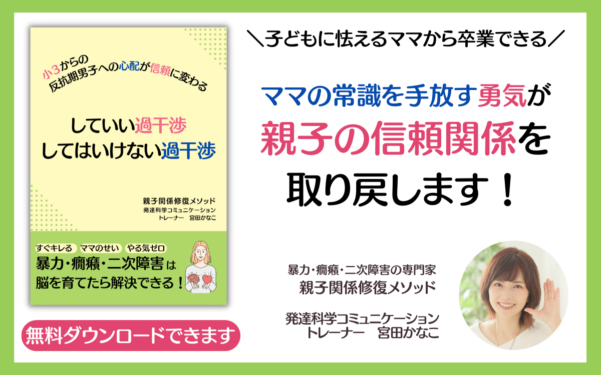 はじめまして。発達科学コミュニケーショントレーナー宮田かなこです。私は、暴力・癇癪・二次障害の専門家として活動しています。この度、進級進学シーズンにおいての親子関係のトラブル予防にお役立ていただける、「小3以上の反抗期男子への心配が信頼に変わるしていい過干渉 してはいけない過干渉」無料電子書籍をリリースいたしました。