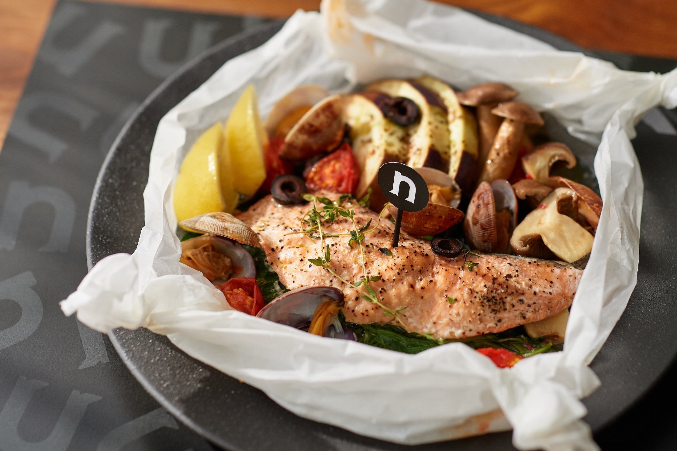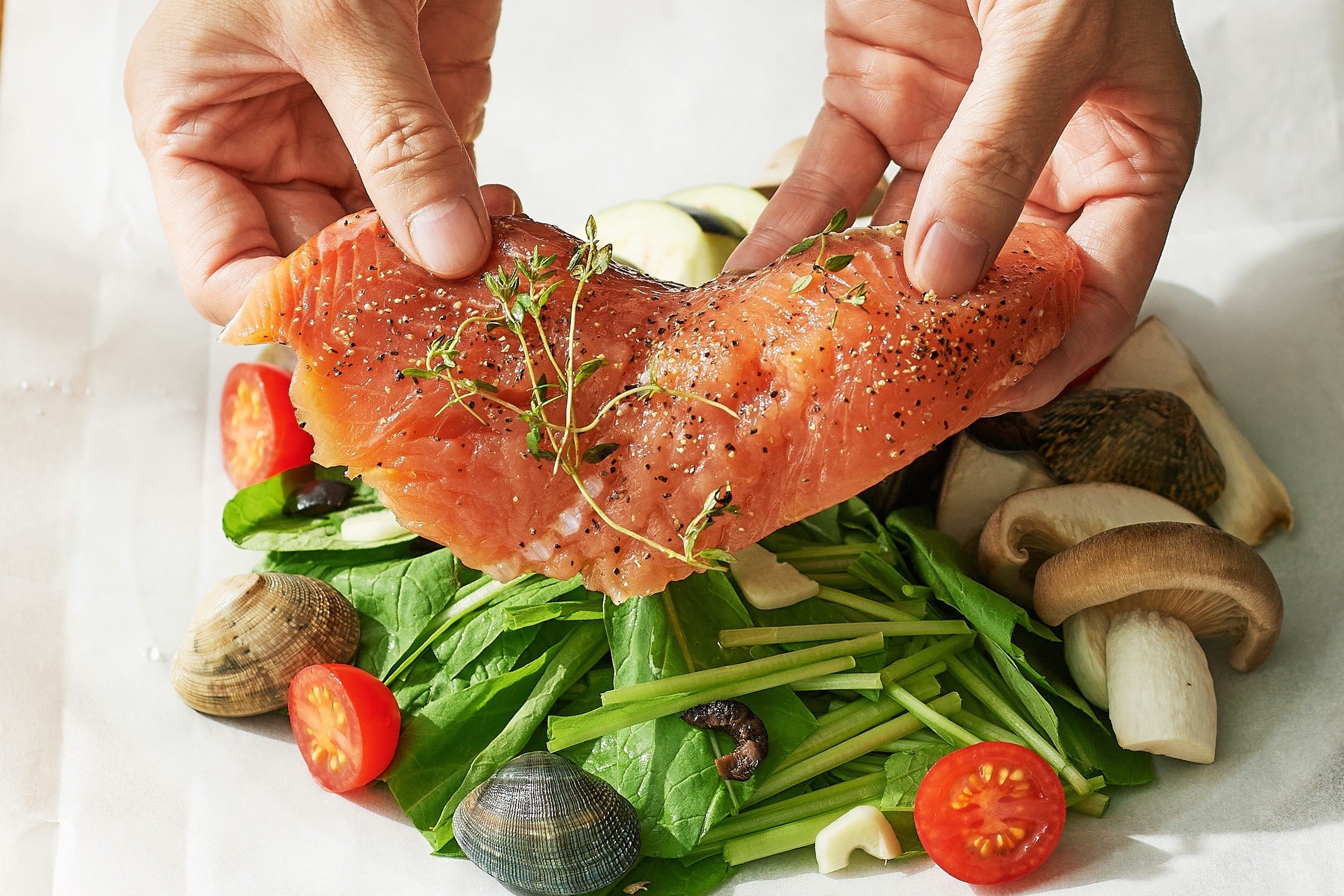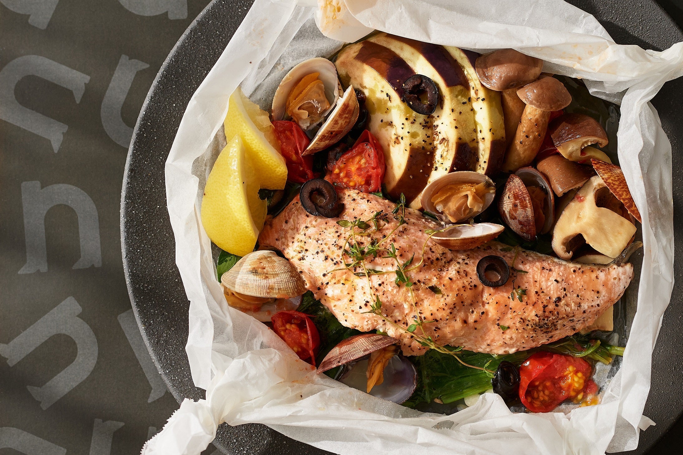 ① お皿の上にクッキングペーパーを置き、京野菜を彩りよく乗せ、軽く塩・胡椒した魚の切り身とあさりを乗せる。