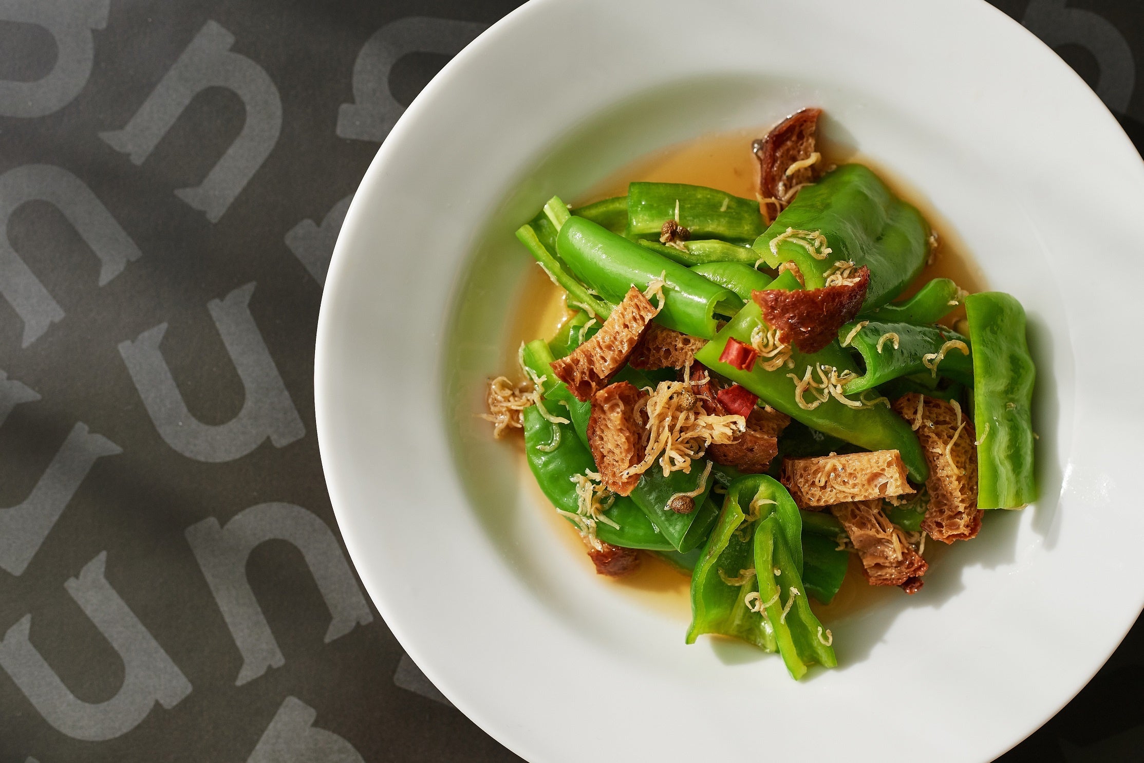 ① 万願寺とうがらしは縦半分に切り、ヘタと種を取り除き、一口大に切る。