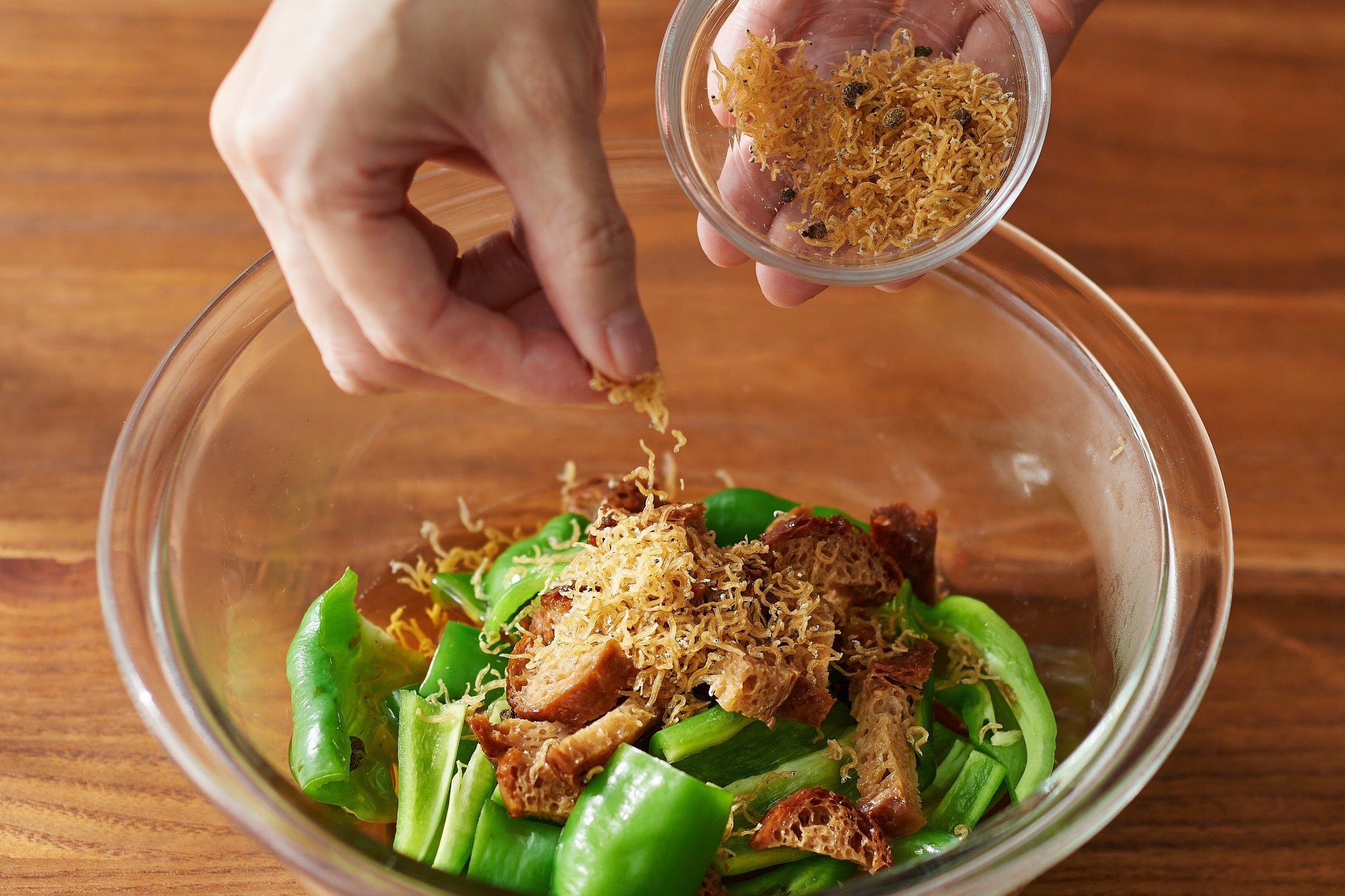 ③ ちりめん山椒とひと口大に切った利休麩を加え混ぜ合わせる。