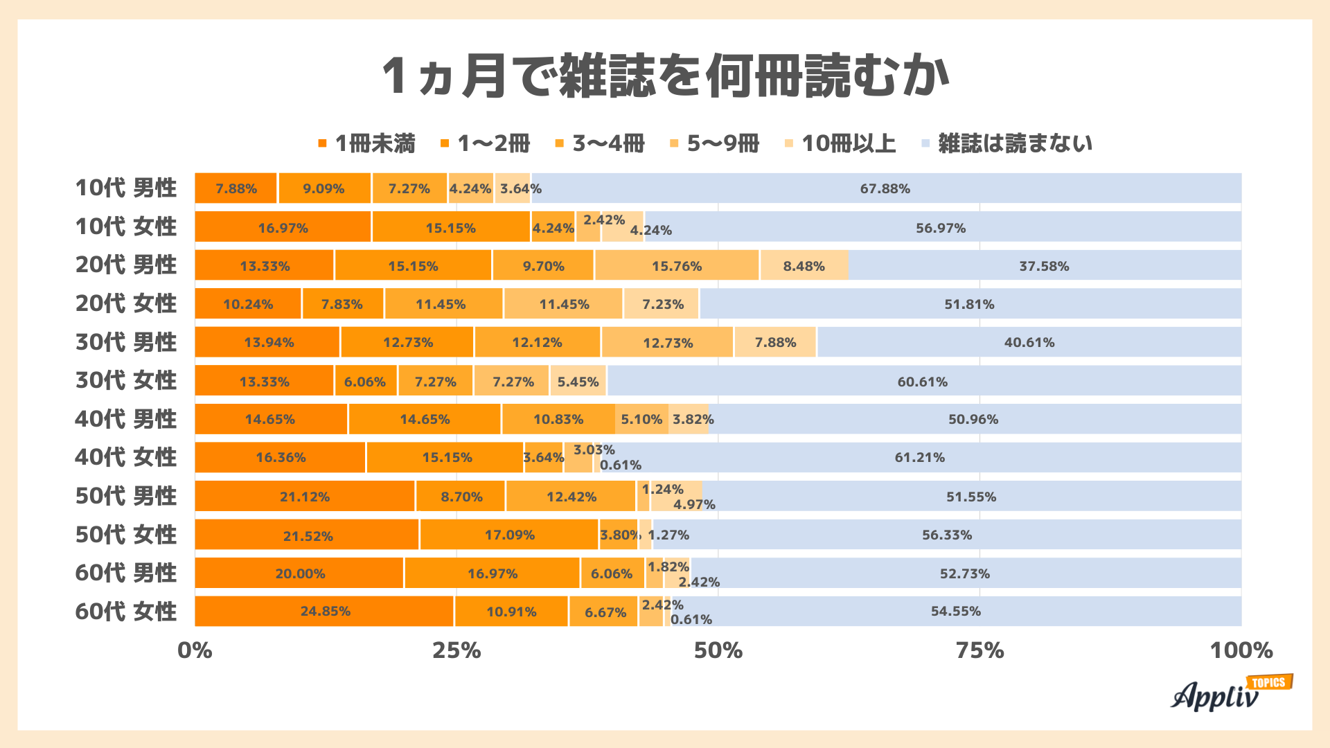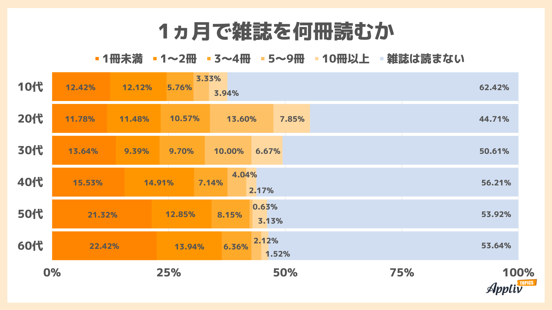 50~60代は10代40代に比べて「雑誌は読まない」の割合は小さいですが、「1冊未満」の割合が大きいのが特徴的です。3冊以上読んでいる人の割合は10代よりも小さく、雑誌をライトに楽しんでいる方が多いようです。