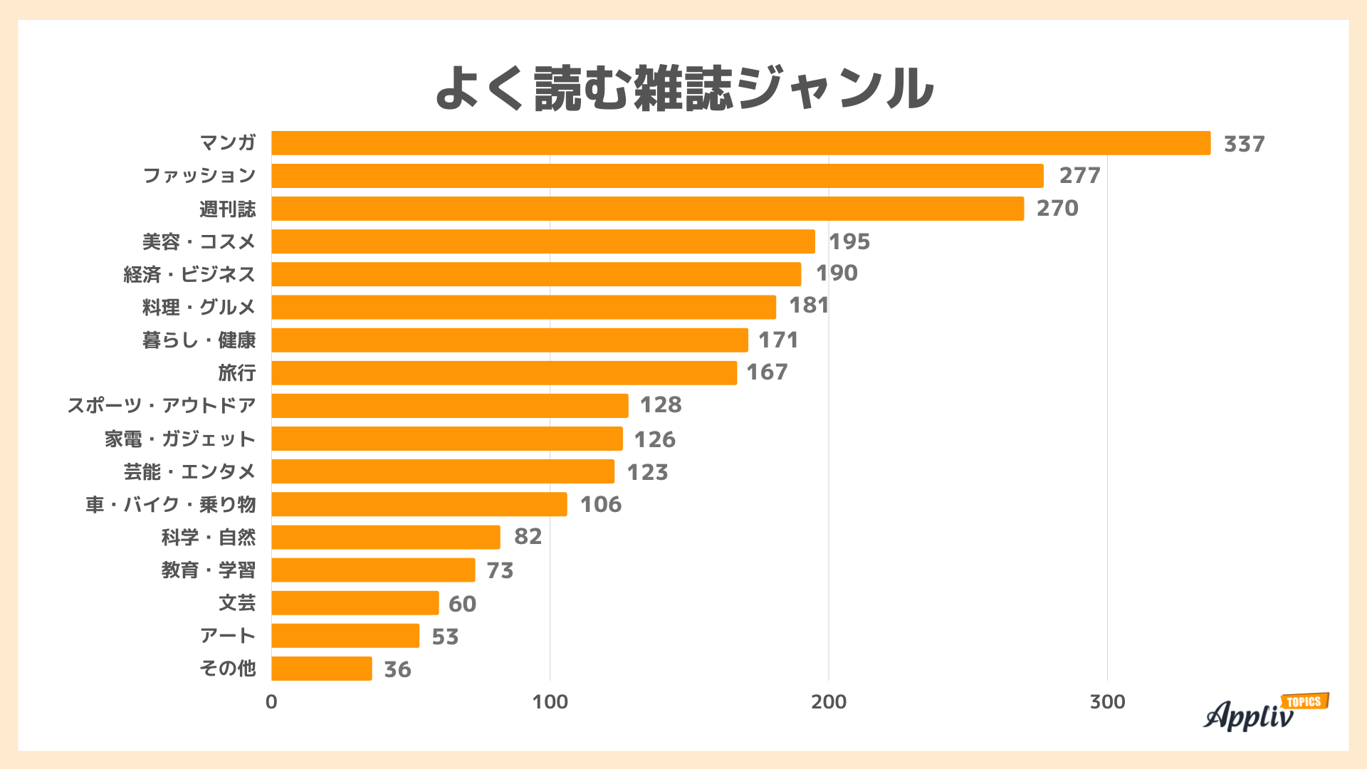 ■人気の雑誌ジャンルは「マンガ」「ファッション」「週刊誌」