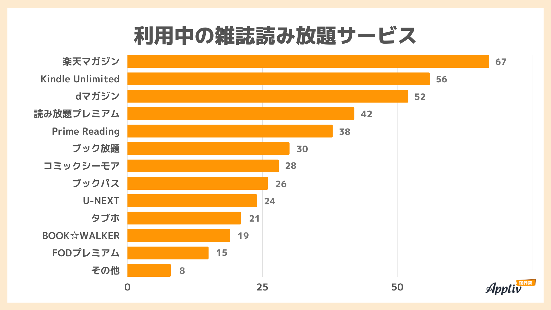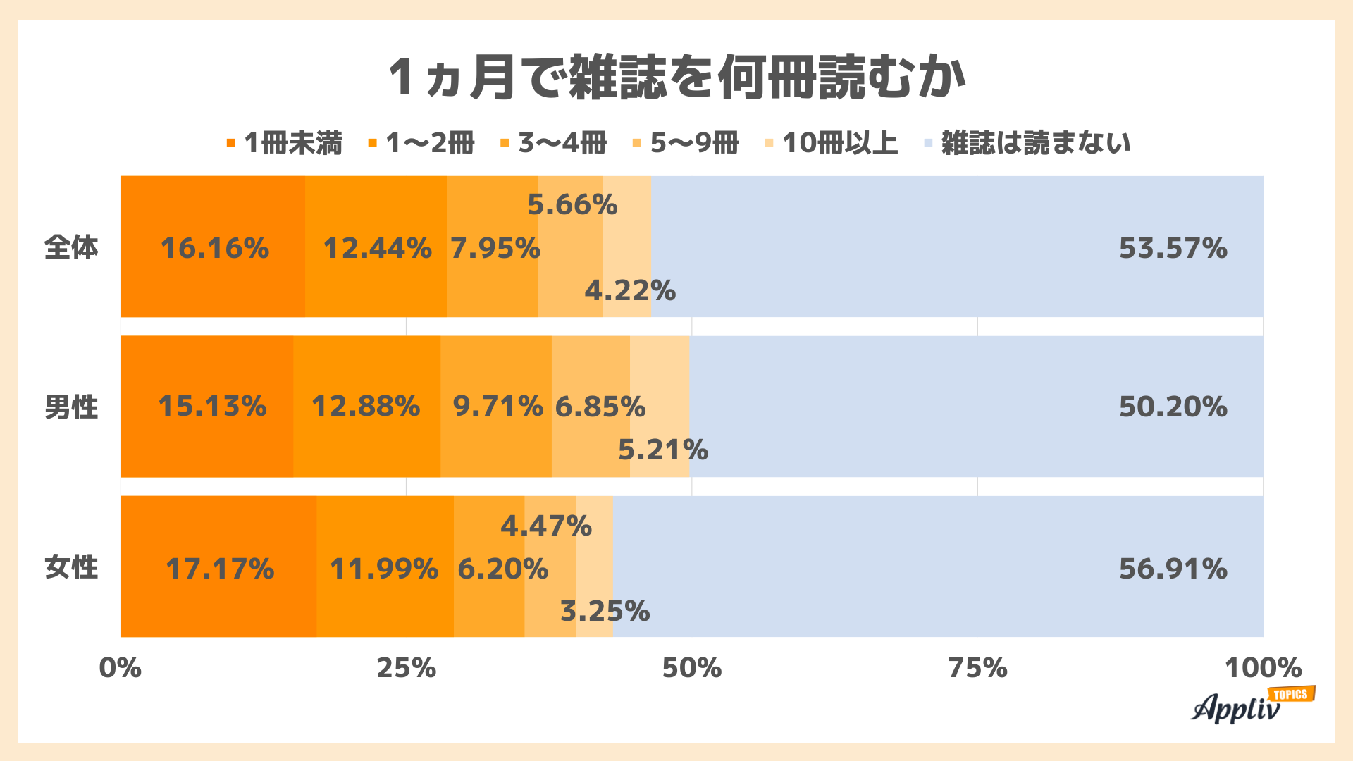 雑誌の購読実態調査 「読まない」が53.57% 最も雑誌をよく読むのは20代男性 読み放題サービス人気1位は「楽天マガジン」(Appliv TOPICS調べ)