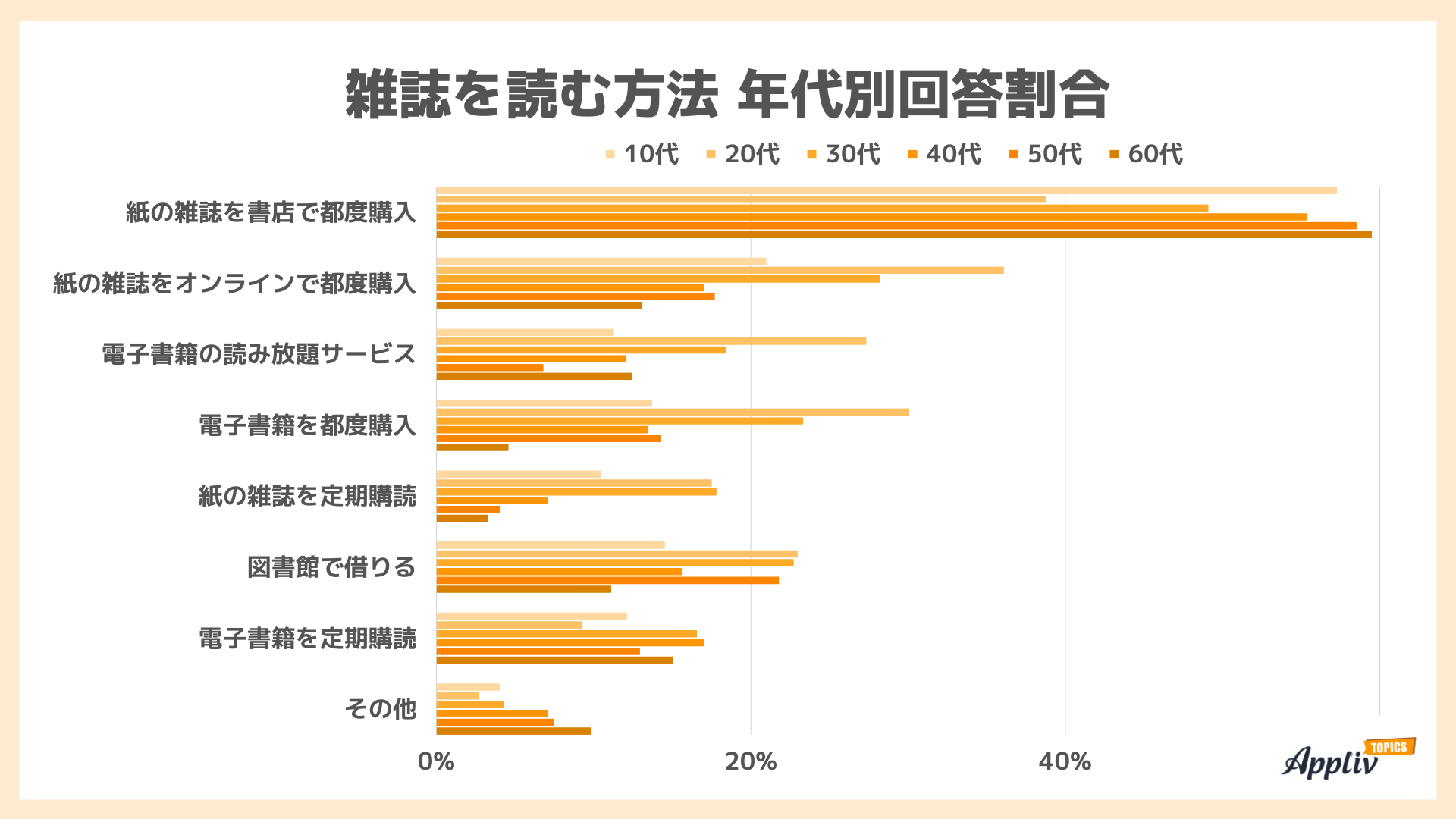 一方で20代は「紙の雑誌をオンラインで都度購入」「電子書籍の読み放題サービス」「電子書籍を都度購入」の割合が、他の年代よりも大きいのが特徴的です。