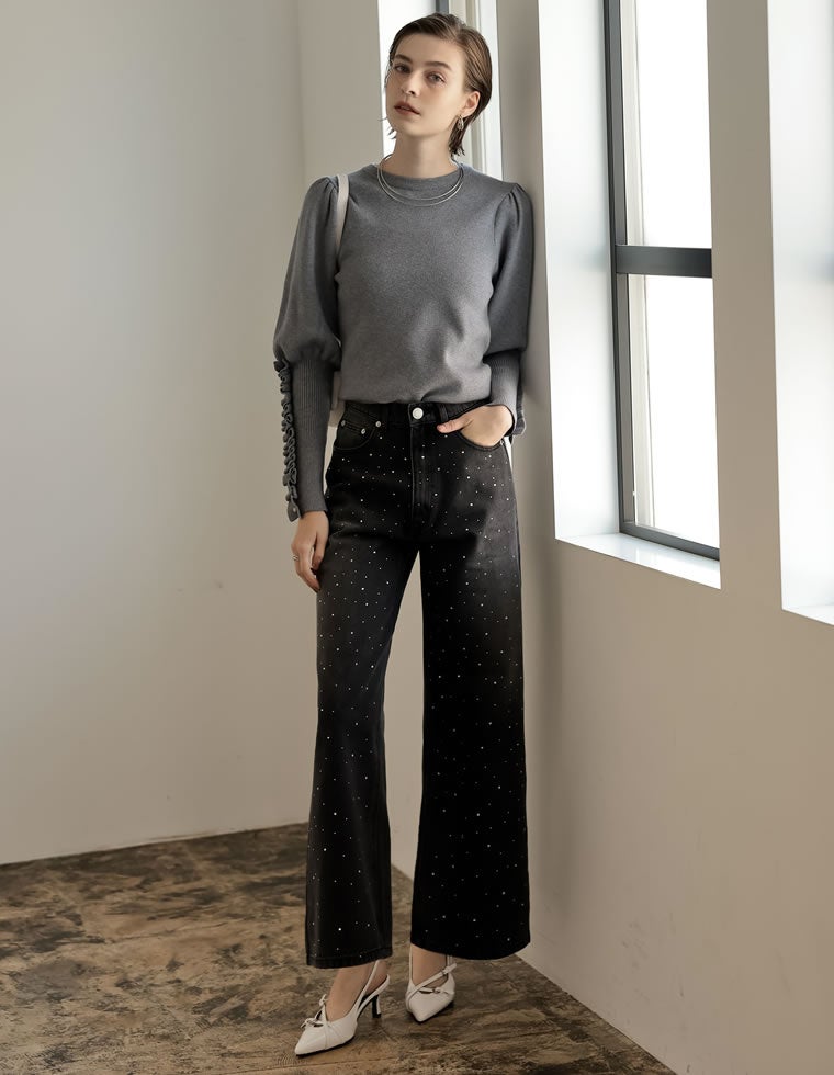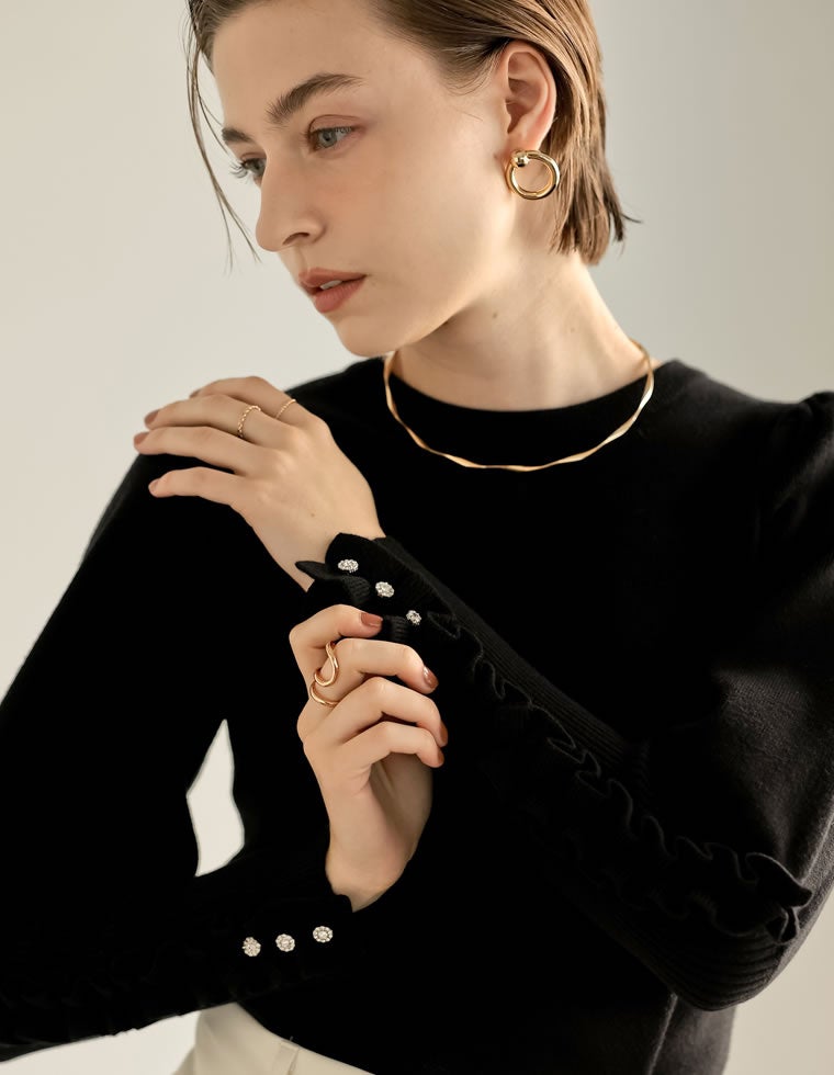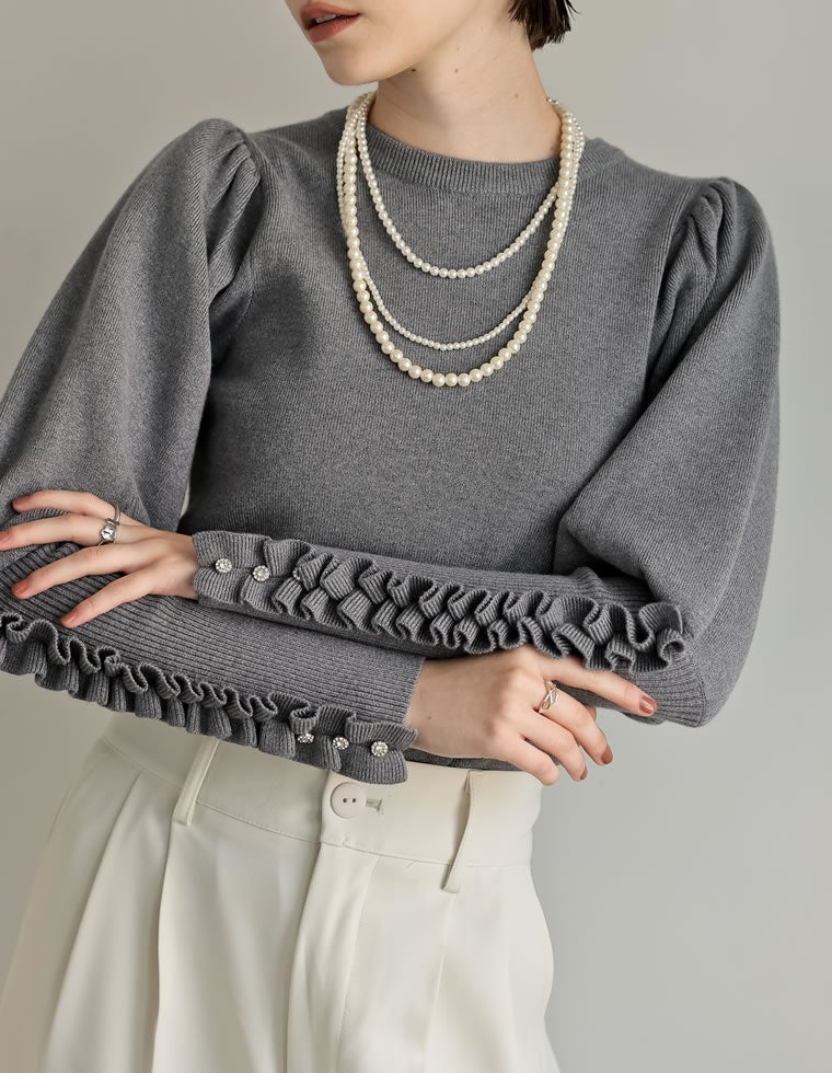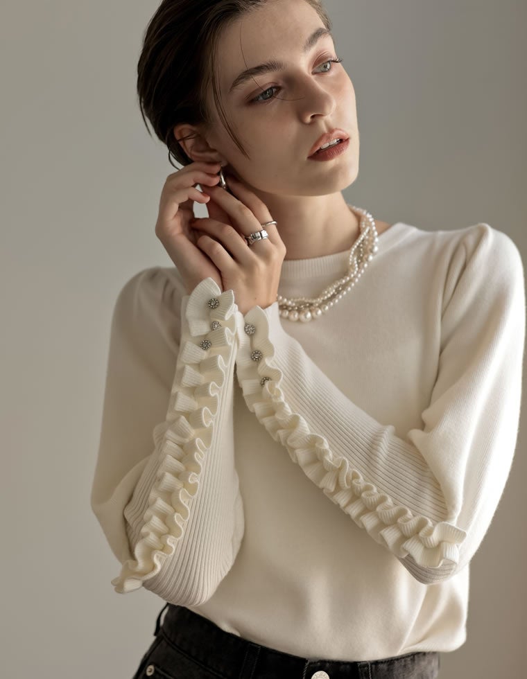 袖口のフリルとビジューが、クラス感漂うエレガントニットが登場。