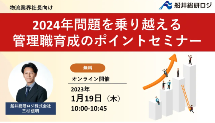ロジスティクス・物流コンサルティングサービスを提供する船井総研ロジ株式会社(東京本社:東京都千代田区、代表:菅重宏、以下「船井総研ロジ」)は、2022年1月19日(木)10:00~10:45に物流企業の経営者へ向けて「2024年問題を乗り越える管理職育成のポイントセミナー」をオンラインで開催いたしました。