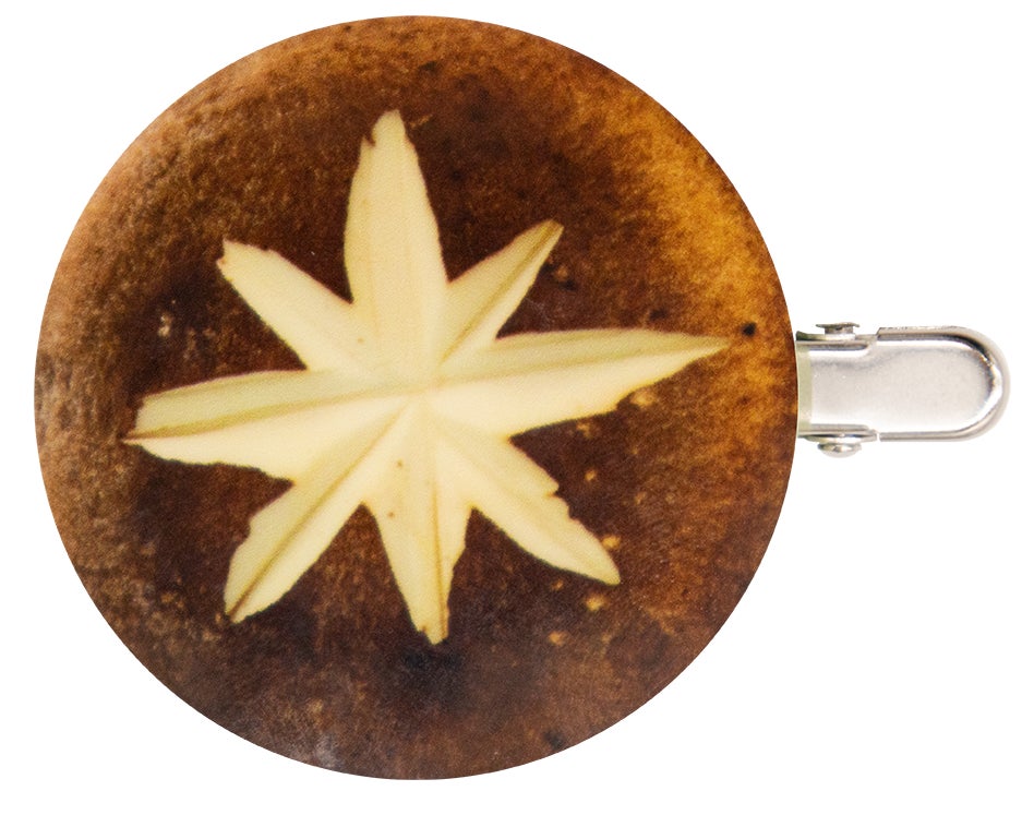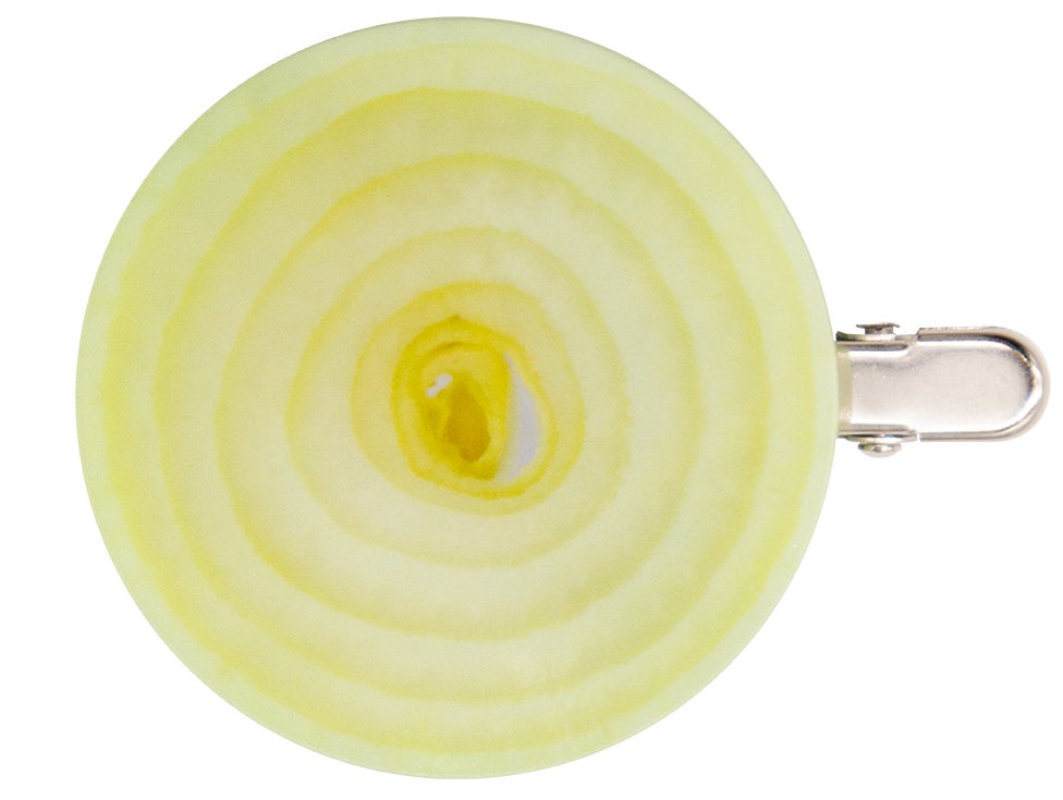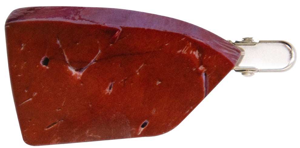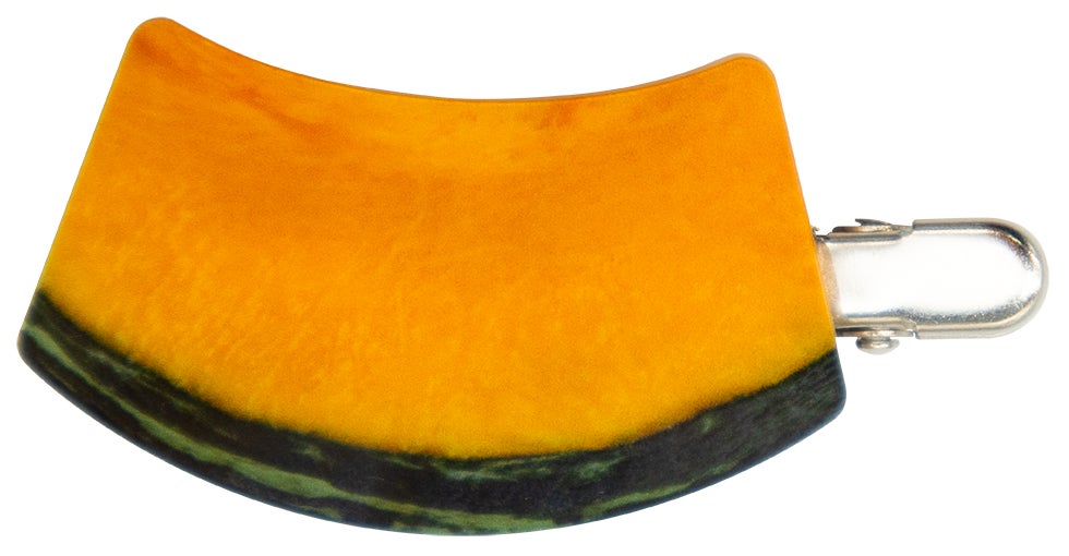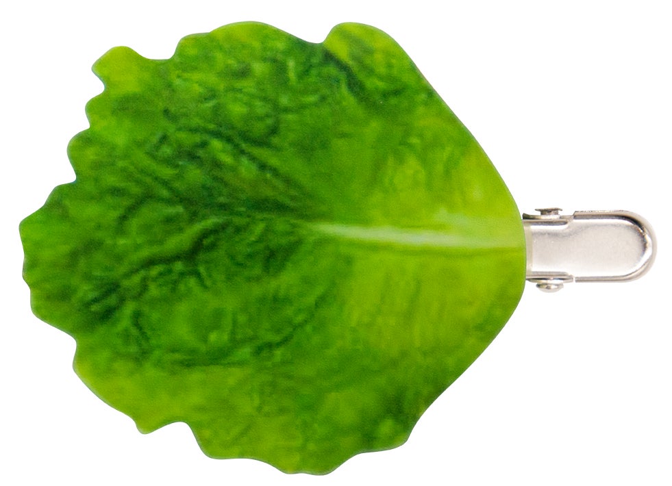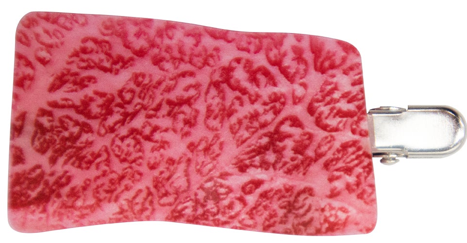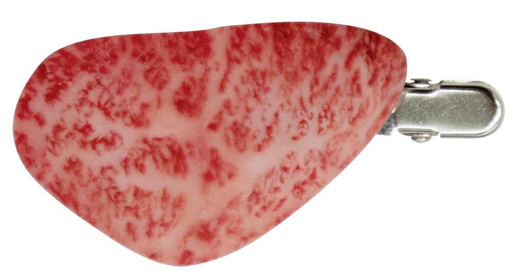 表から見ても裏から見ても焼肉デザインの前髪クリップ。クリップ部分がトングになっています。