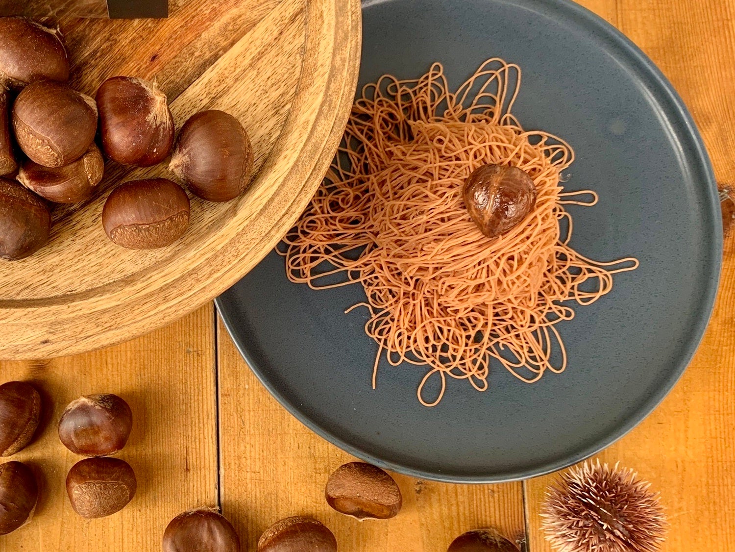 - イタリア産渋皮栗と和栗を独自にブレンド。口の中でほどける食感を生み出す直径1mmのマロンクリームが特徴の「生搾りモンブラン」