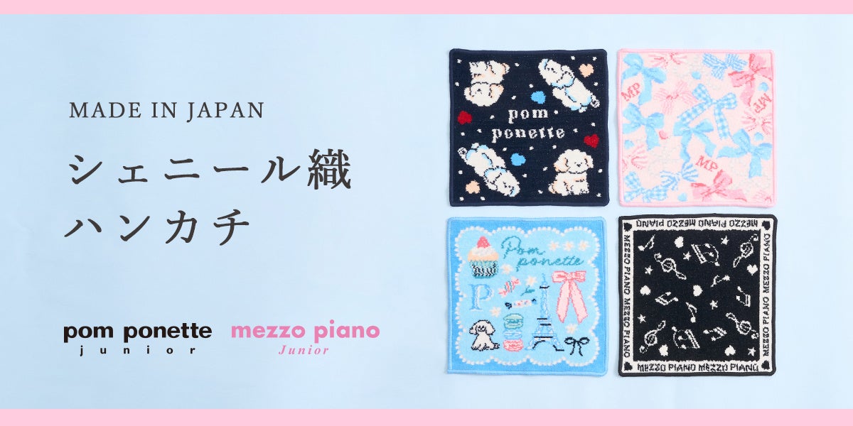 株式会社ナルミヤ・インターナショナル(本社:東京都港区、代表取締役社長執行役員:保坂 大輔)が展開するブランド「mezzo piano junior(メゾピアノジュニア)」と「pom ponette junior(ポンポネット ジュニア)」から、それぞれのブランド世界観を表現したオリジナルデザインの日本製シェニール織ハンカチを展開いたします。シェニール織ならではのふっくらとした上質な手触りで、普段使いはもちろん、ギフトにも最適な一枚です。毎日の持ち歩きがちょっと楽しくなるような、かわいらしさと使い心地を兼ね備えたアイテムに仕上げました。