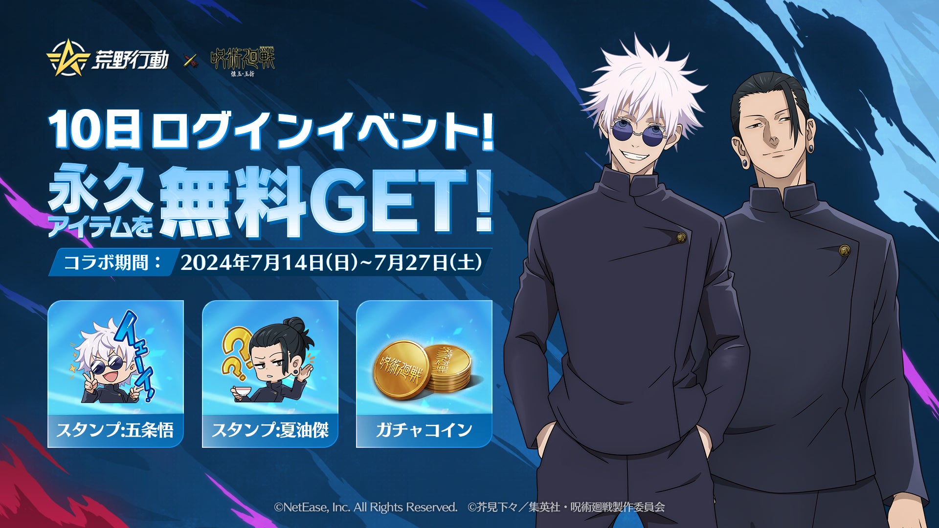 NetEase Gamesが開発・運営する大人気スマホゲーム『荒野行動』にて、2024年7月14日から7月27日の期間中、TVアニメ『呪術廻戦』とのコラボイベント第3弾を開催いたします。