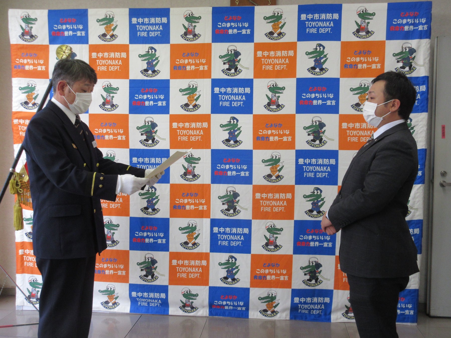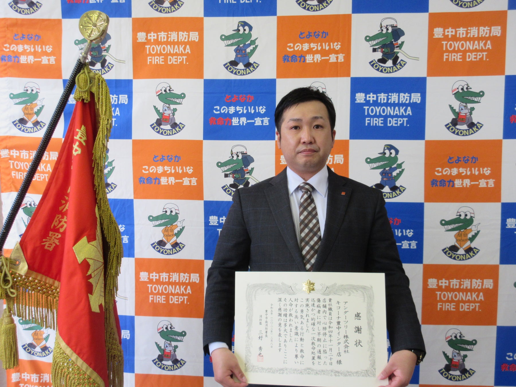 豊中南消防署は、キコーナ豊中インター店で心肺停止状態となった20代の男性客への救命処置を行った同店舗に対し、その勇気ある行動と救命に対する高い意識をたたえ、感謝状を贈呈しました。