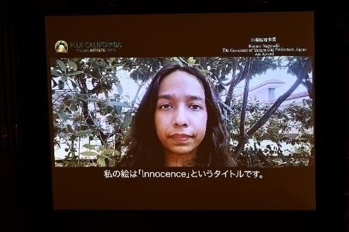 受賞式では、約1,800点の応募作品の中から選ばれた7名の作品が紹介されました。そのうち、山梨県知事賞を受賞したのは、インド国籍のNandini Agrawalさんによる作品『Innocence』です。Nandiniさんはオンラインで式に参加し、「国際的な場で評価されるとは思っていませんでした。世界中の若者の声を紹介してくれることは素晴らしいことです」と感謝の言葉を述べました。