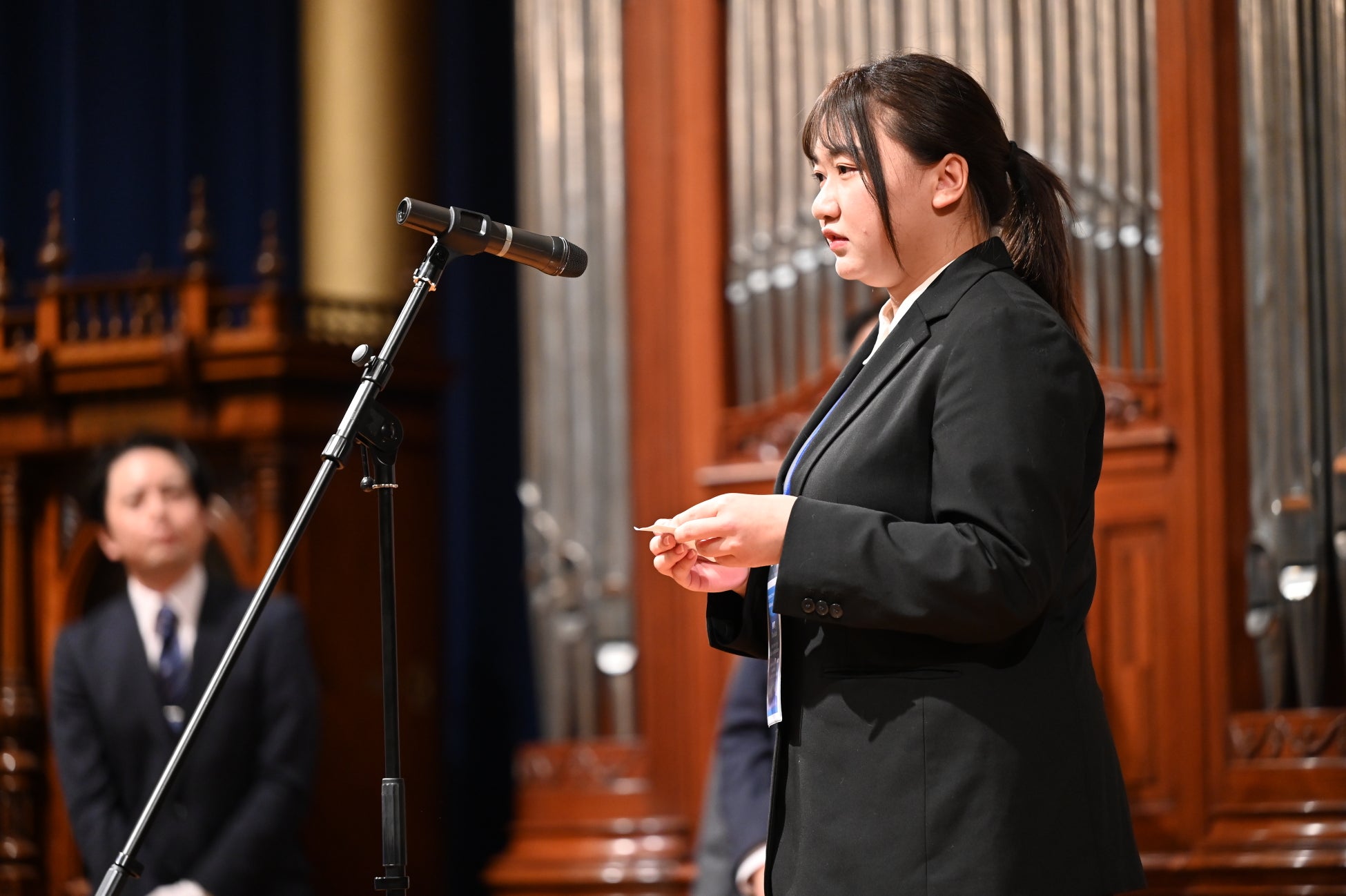 また、短い言葉で深いメッセージを伝える作品に贈られる「山梨県知事言霊プレゼンテーション賞」に選ばれたのは、張嘉薇(チョウ カミ)さんの映像作品『The Flower of Harmony Blooming in Peace』です。張さんは、食料不足や貧富の差といった社会課題を描きながら、共存と調和の大切さを力強く訴えました。